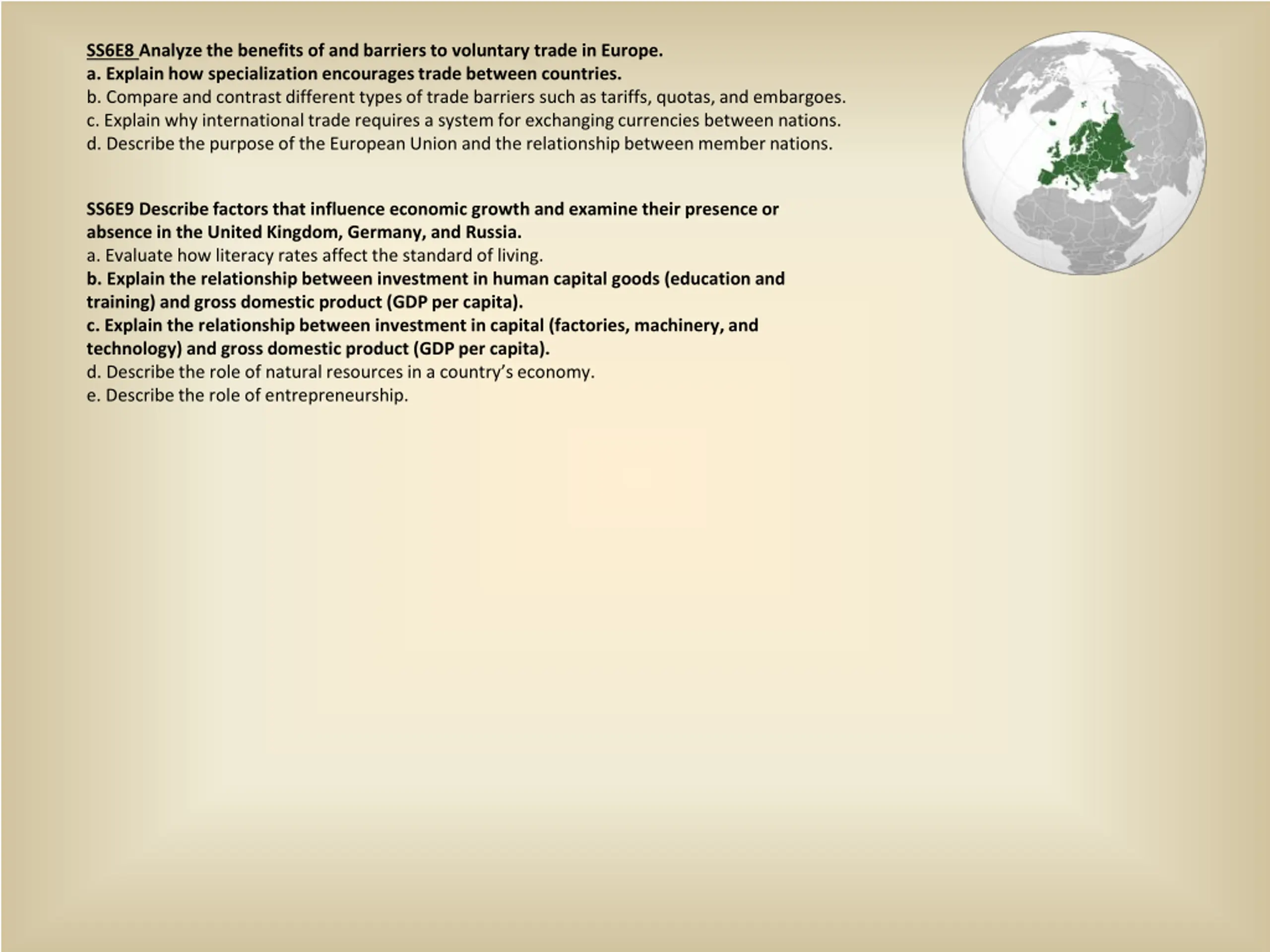 SS6E8 Analyze the benefits of and barriers to voluntary trade in Europe. a. Explain how specialization encourages trade between countries. b. Compare and contrast different types of trade barriers such as tariffs, quotas, and embargoes. c. Explain why international trade requires a system for exchanging currencies between nations. d. Describe the purpose of the European Union and the relationship between member nations. SS6E9 Describe factors that influence economic growth and examine their presence or absence in the United Kingdom, Germany, and Russia. a. Evaluate how literacy rates affect the standard of living. b. Explain the relationship between investment in human capital goods (education and training) and gross domestic product (GDP per capita). c. Explain the relationship between investment in capital (factories, machinery, and technology) and gross domestic product (GDP per capita). d. Describe the role of natural resources in a country s economy. e. Describe the role of entrepreneurship.