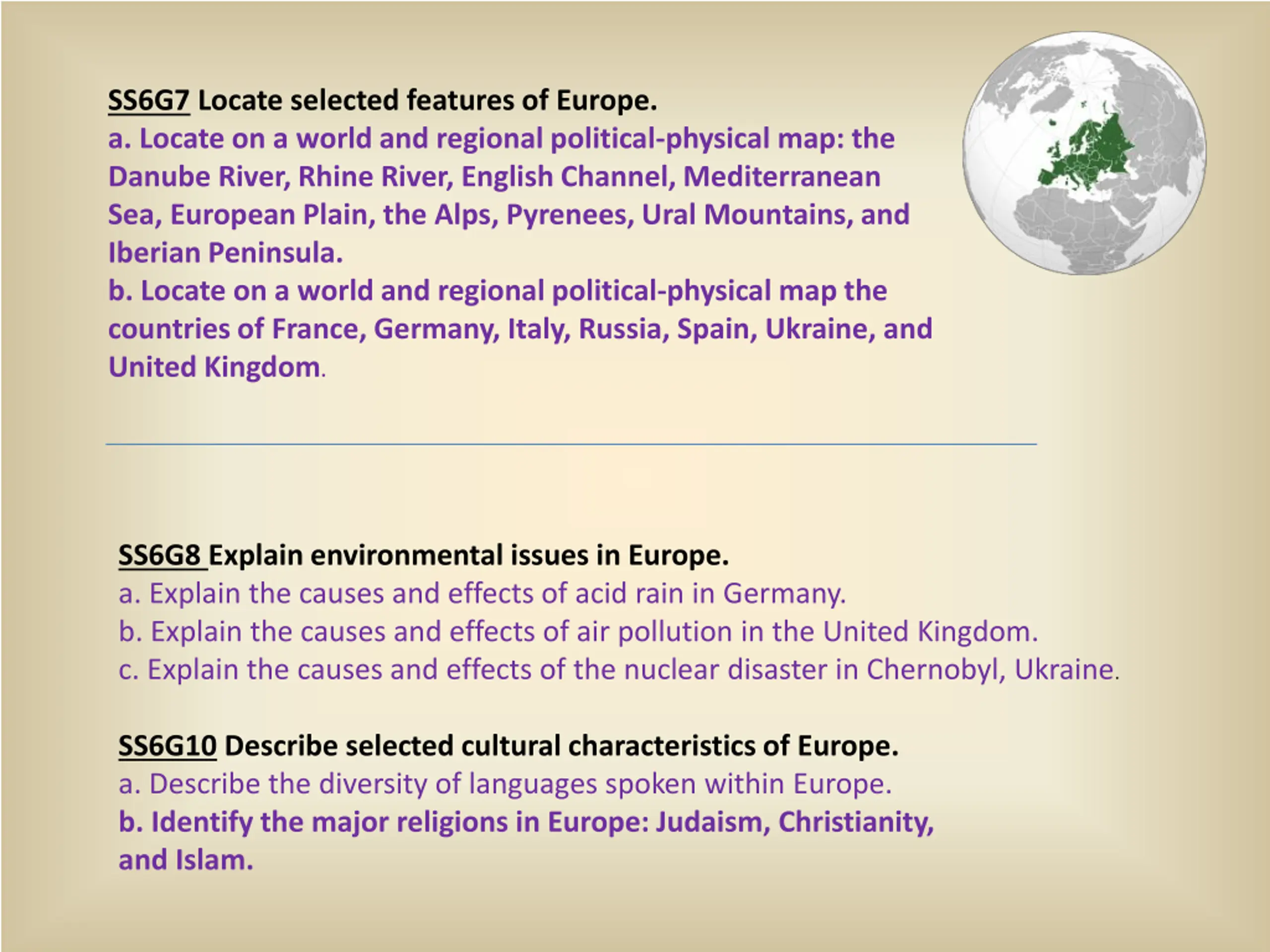 SS6G7 Locate selected features of Europe. a. Locate on a world and regional political-physical map: the Danube River, Rhine River, English Channel, Mediterranean Sea, European Plain, the Alps, Pyrenees, Ural Mountains, and Iberian Peninsula. b. Locate on a world and regional political-physical map the countries of France, Germany, Italy, Russia, Spain, Ukraine, and United Kingdom. SS6G8 Explain environmental issues in Europe. a. Explain the causes and effects of acid rain in Germany. b. Explain the causes and effects of air pollution in the United Kingdom. c. Explain the causes and effects of the nuclear disaster in Chernobyl, Ukraine. SS6G10 Describe selected cultural characteristics of Europe. a. Describe the diversity of languages spoken within Europe. b. Identify the major religions in Europe: Judaism, Christianity, and Islam.