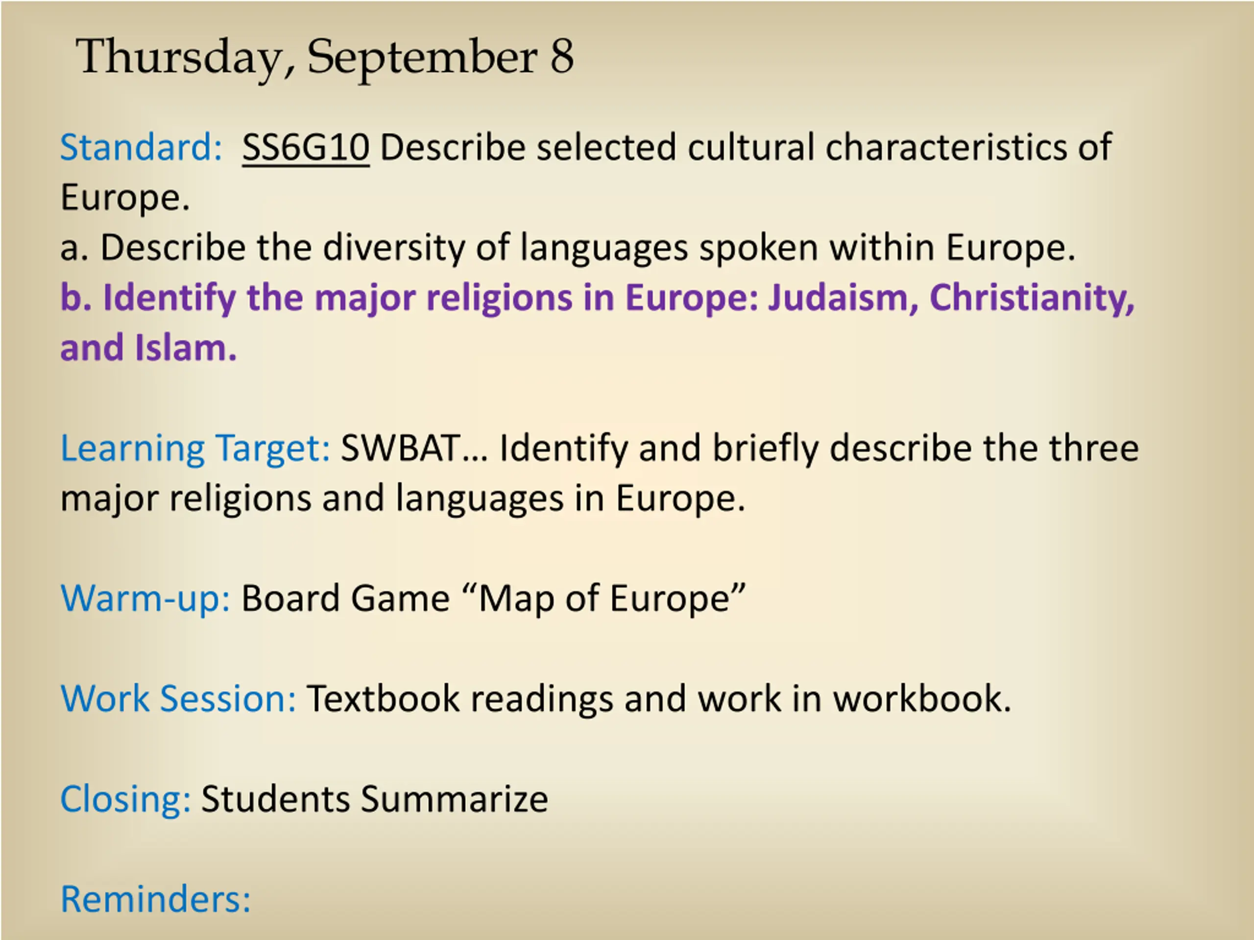 Thursday, September 8 Standard: SS6G10 Describe selected cultural characteristics of Europe. a. Describe the diversity of languages spoken within Europe. b. Identify the major religions in Europe: Judaism, Christianity, and Islam. Learning Target: SWBAT Identify and briefly describe the three major religions and languages in Europe. Warm-up: Board Game Map of Europe Work Session: Textbook readings and work in workbook. Closing: Students Summarize Reminders: