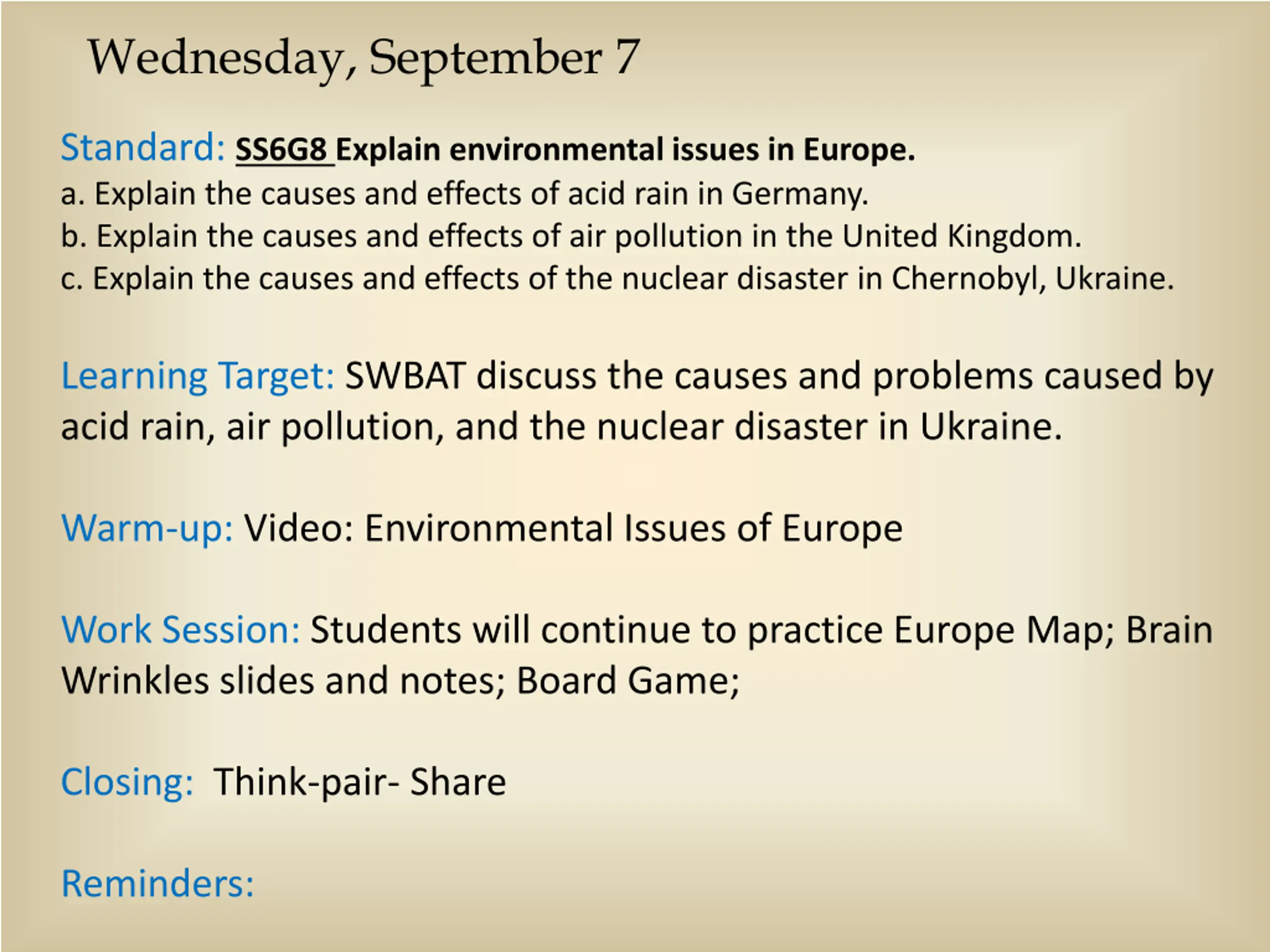 Wednesday, September 7 Standard: SS6G8 Explain environmental issues in Europe. a. Explain the causes and effects of acid rain in Germany. b. Explain the causes and effects of air pollution in the United Kingdom. c. Explain the causes and effects of the nuclear disaster in Chernobyl, Ukraine. Learning Target: SWBAT discuss the causes and problems caused by acid rain, air pollution, and the nuclear disaster in Ukraine. Warm-up: Video: Environmental Issues of Europe Work Session: Students will continue to practice Europe Map; Brain Wrinkles slides and notes; Board Game; Closing: Think-pair- Share Reminders: