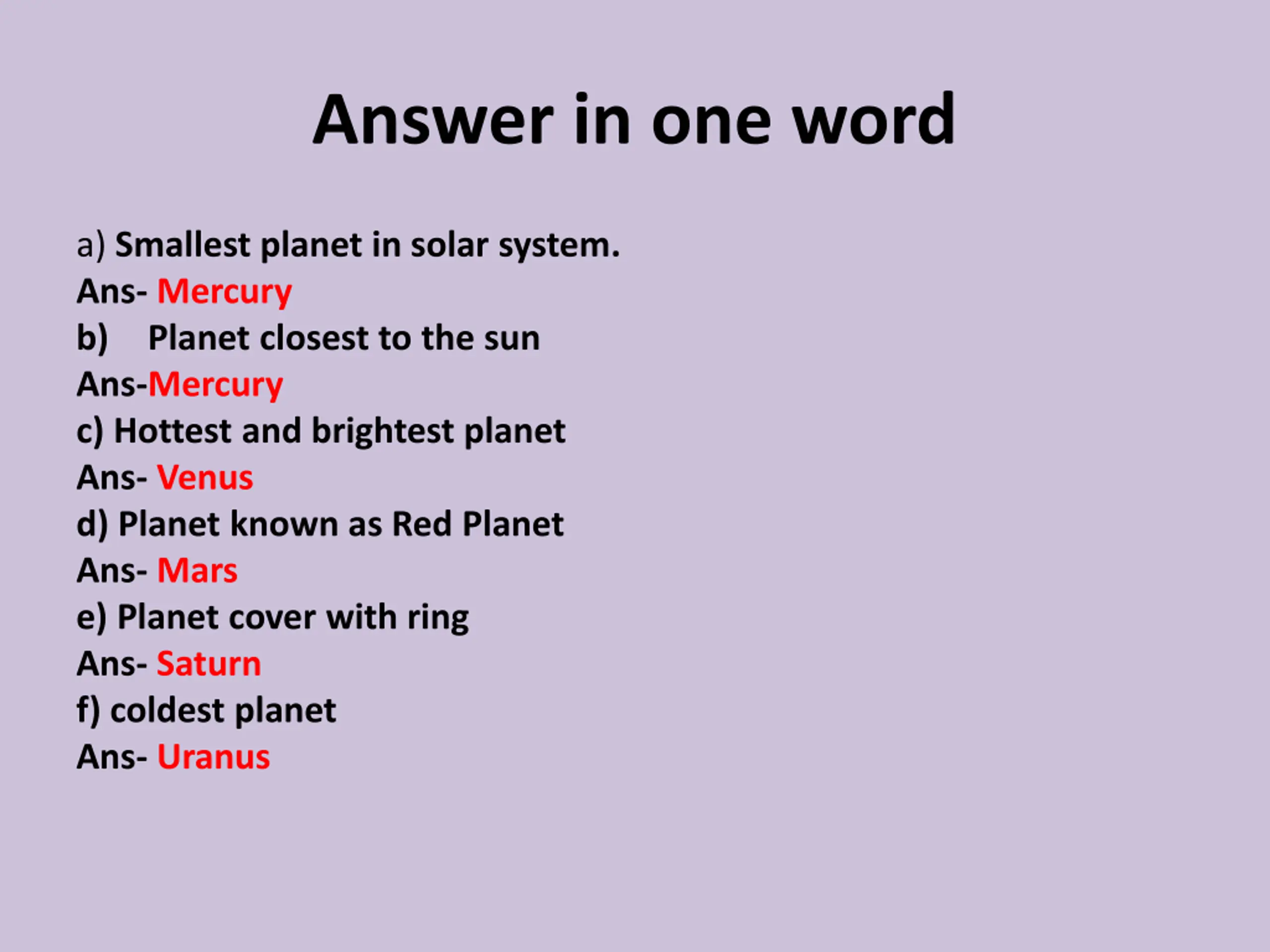 Answer in one word a) Smallest planet in solar system. Ans- Mercury b) Planet closest to the sun Ans-Mercury c) Hottest and brightest planet Ans- Venus d) Planet known as Red Planet Ans- Mars e) Planet cover with ring Ans- Saturn f) coldest planet Ans- Uranus