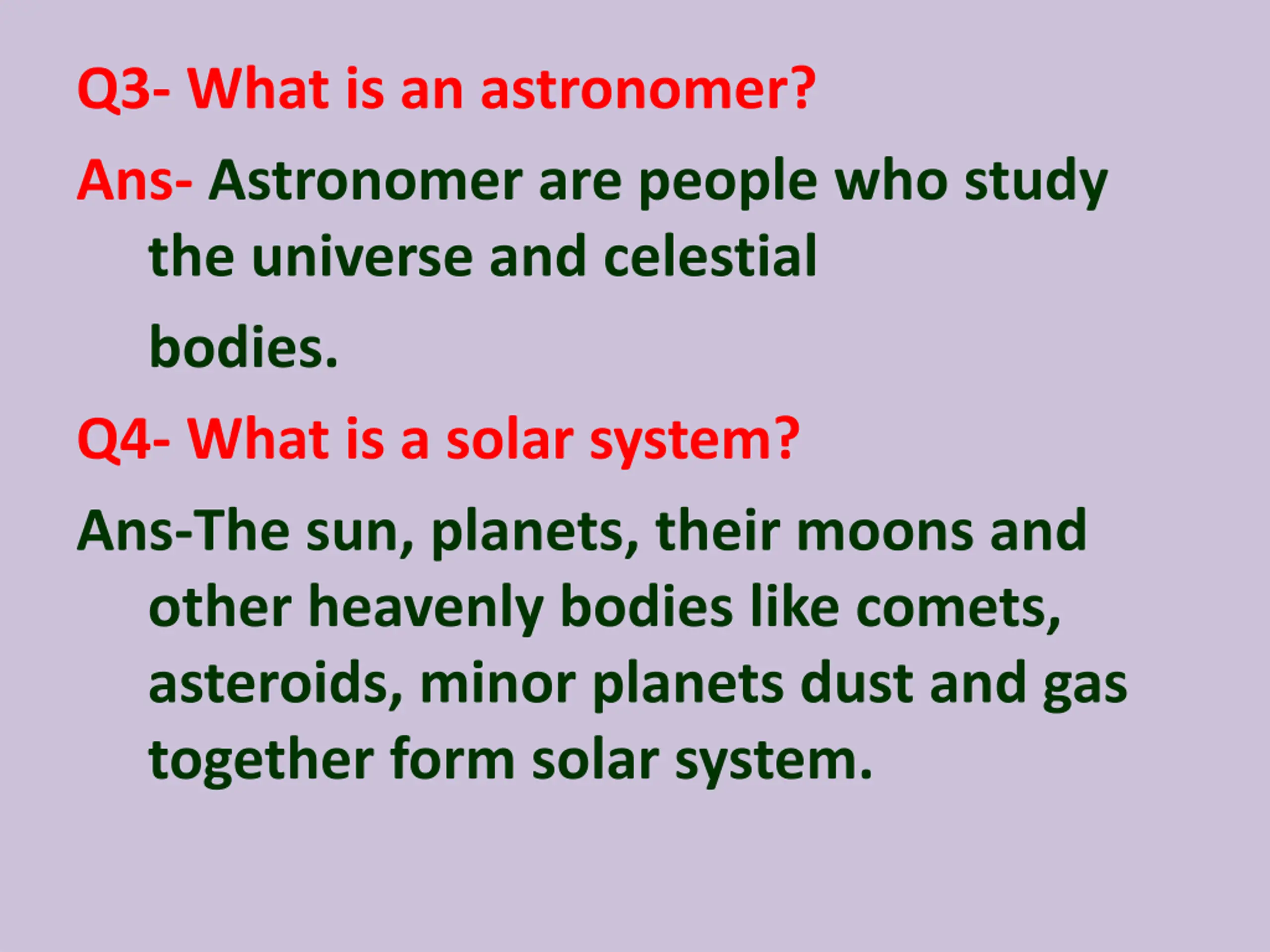 Q3- What is an astronomer? Ans- Astronomer are people who study the universe and celestial bodies. Q4- What is a solar system? Ans-The sun, planets, their moons and other heavenly bodies like comets, asteroids, minor planets dust and gas together form solar system.