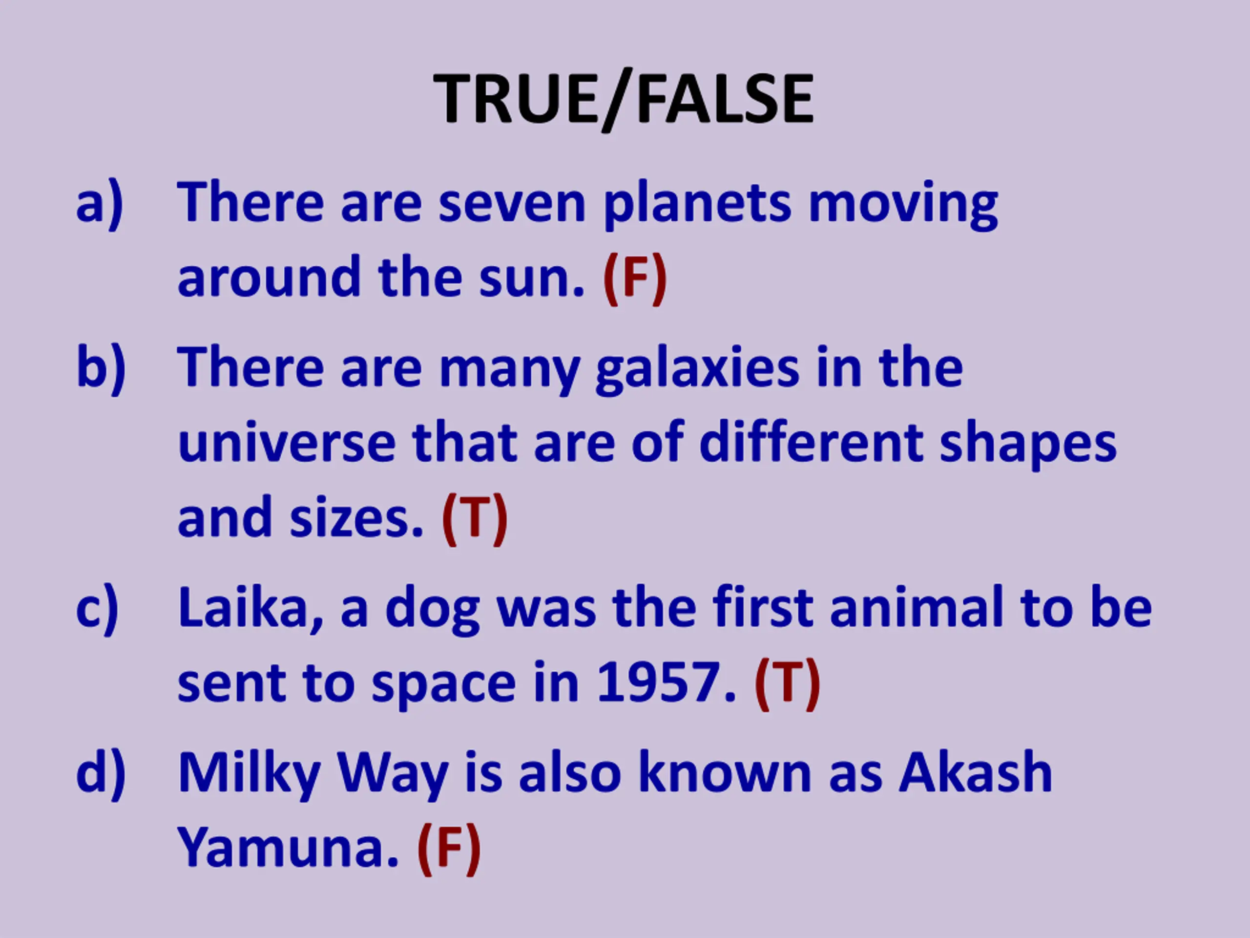 TRUE/FALSE a) There are seven planets moving around the sun. (F) b) There are many galaxies in the universe that are of different shapes and sizes. (T) c) Laika, a dog was the first animal to be sent to space in 1957. (T) d) Milky Way is also known as Akash Yamuna. (F)