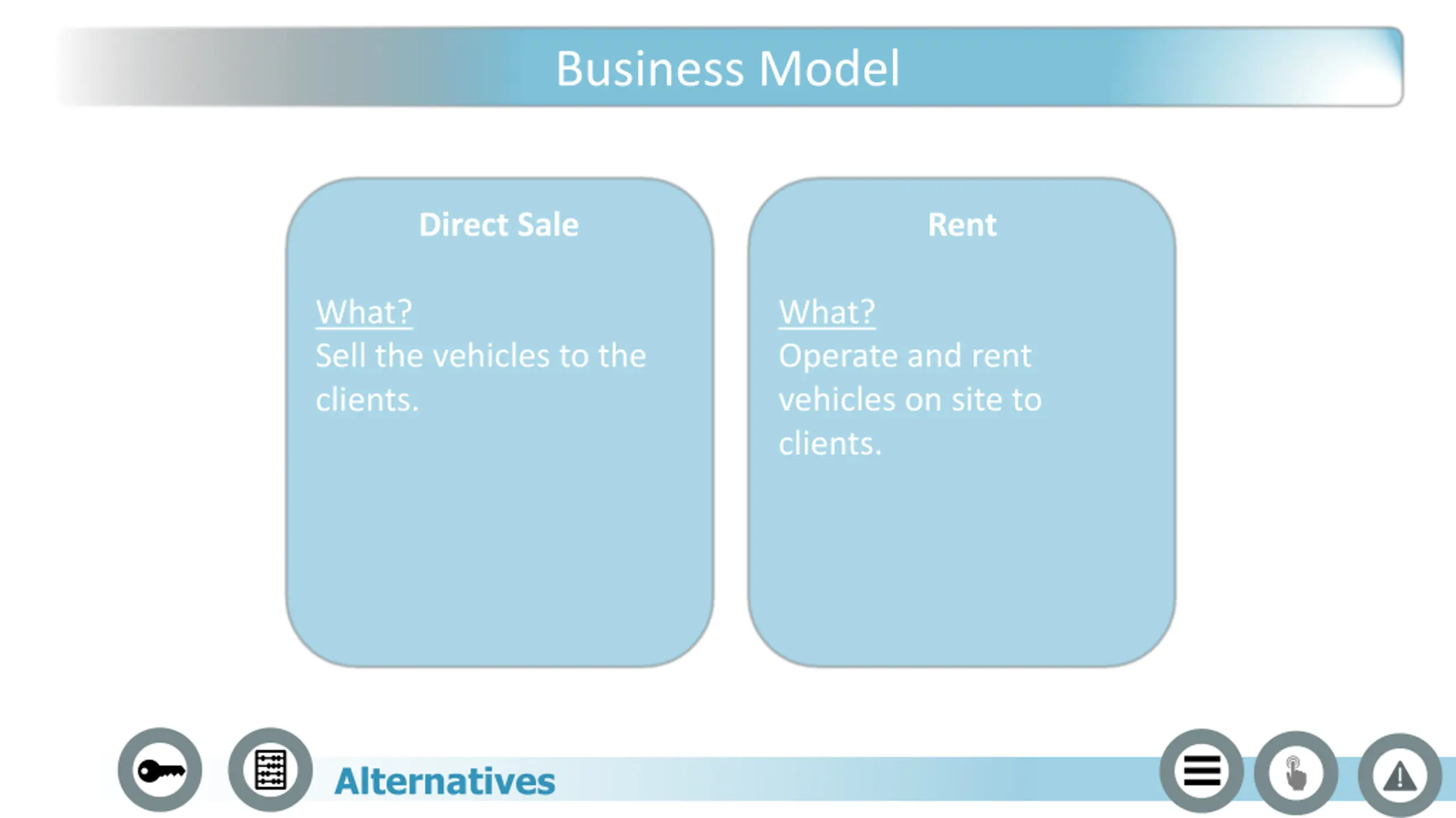 Business Model Direct Sale Rent What? Sell the vehicles to the clients. What? Operate and rent vehicles on site to clients. Alternatives