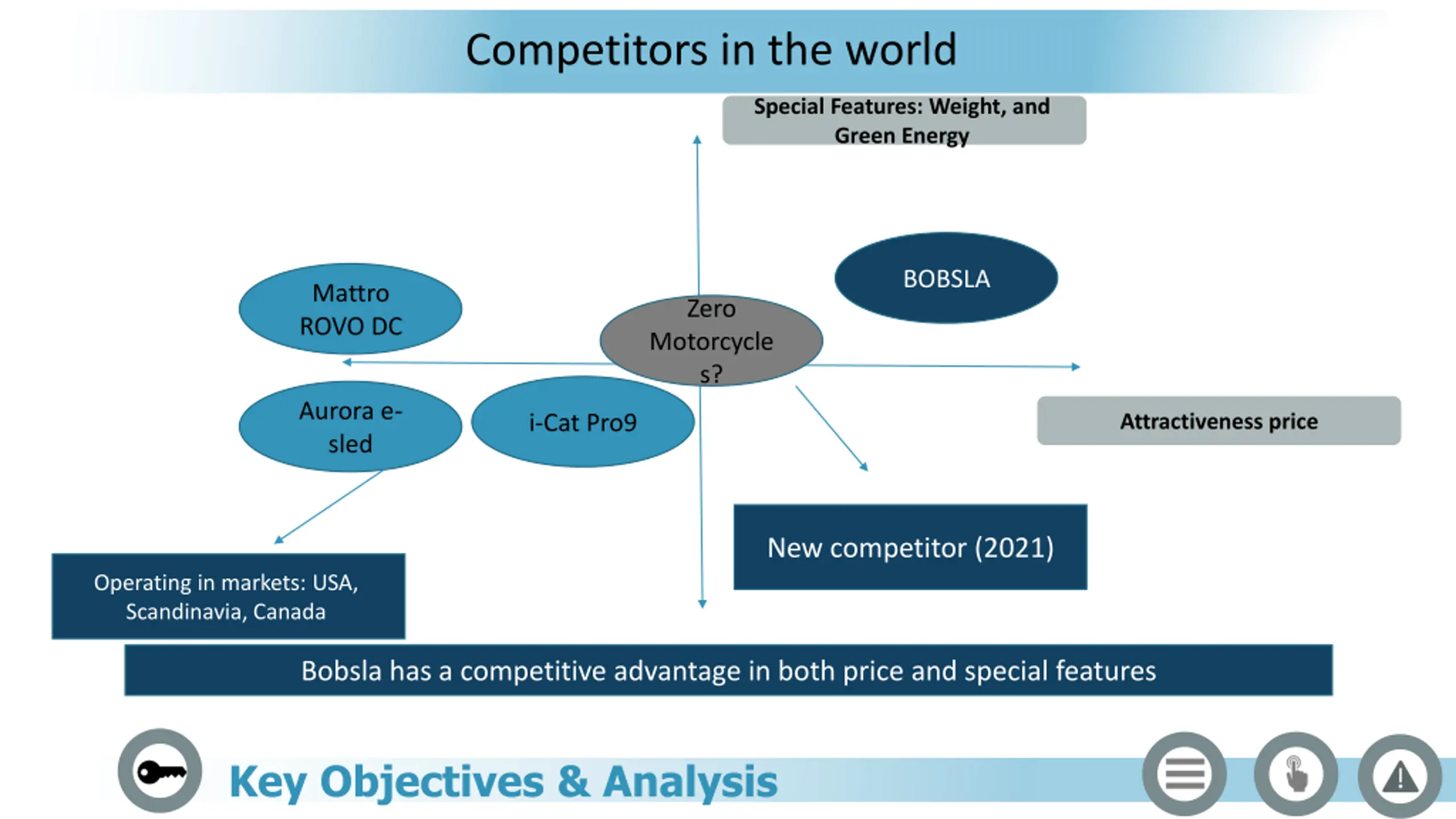 Competitors in the world Special Features: Weight, and Green Energy BOBSLA Mattro ROVO DC Zero Motorcycle s? Aurora e- sled Attractiveness price i-Cat Pro9 New competitor (2021) Operating in markets: USA, Scandinavia, Canada Bobsla has a competitive advantage in both price and special features Key Objectives & Analysis