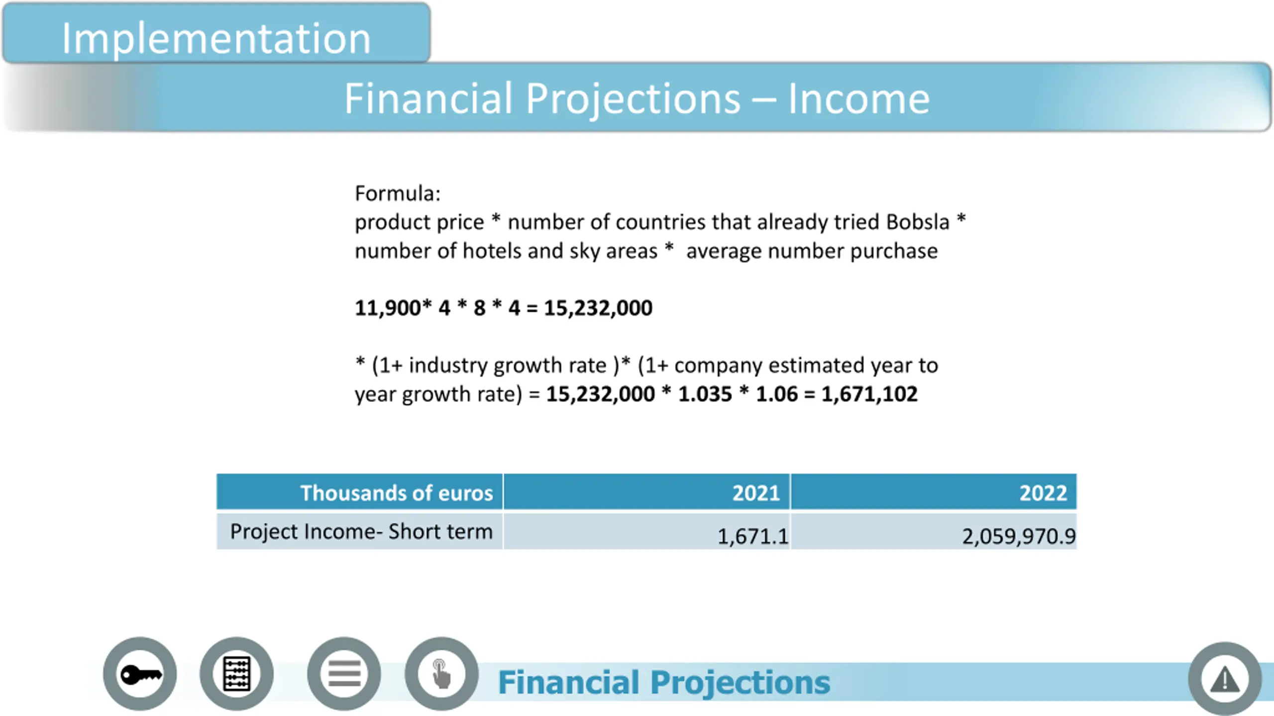 Implementation Financial Projections Income Formula: product price * number of countries that already tried Bobsla * number of hotels and sky areas * average number purchase 11,900* 4 * 8 * 4 = 15,232,000 * (1+ industry growth rate )* (1+ company estimated year to year growth rate) = 15,232,000 * 1.035 * 1.06 = 1,671,102 Thousands of euros 2021 2022 Project Income- Short term 1,671.1 2,059,970.9 Financial Projections