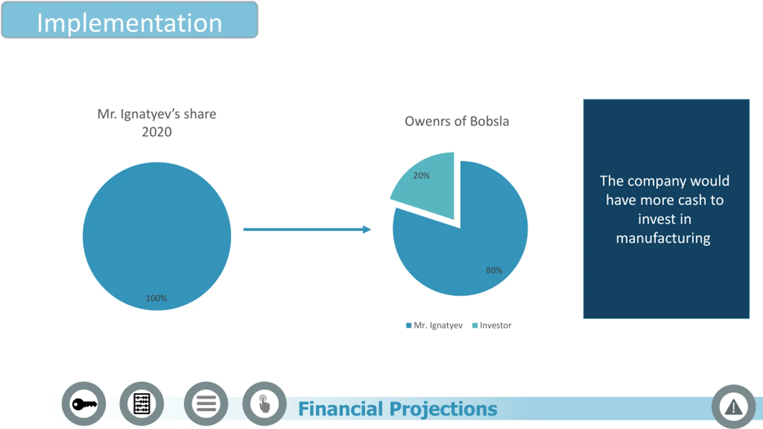 Implementation Mr. Ignatyev s share 2020 Owenrs of Bobsla 20% The company would have more cash to invest in manufacturing 80% 100% Mr. Ignatyev Investor Financial Projections