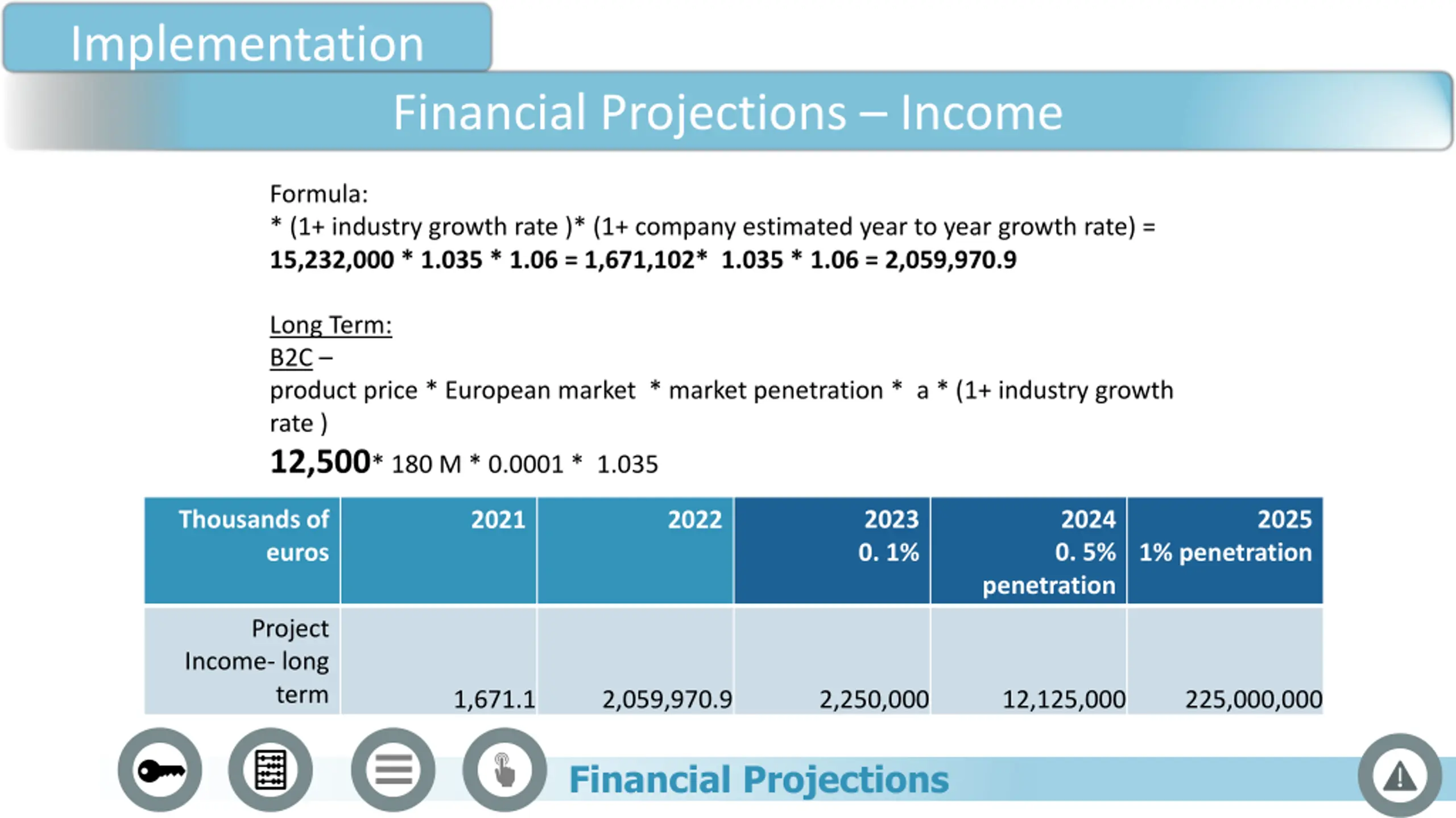 Implementation Financial Projections Income Formula: * (1+ industry growth rate )* (1+ company estimated year to year growth rate) = 15,232,000 * 1.035 * 1.06 = 1,671,102* 1.035 * 1.06 = 2,059,970.9 Long Term: B2C product price * European market * market penetration * a * (1+ industry growth rate ) 12,500* 180 M * 0.0001 * 1.035 Thousands of 2023 0. 1% 2024 0. 5% 2025 2021 2022 euros 1% penetration penetration Project Income- long term 1,671.1 2,059,970.9 2,250,000 12,125,000 225,000,000 Financial Projections