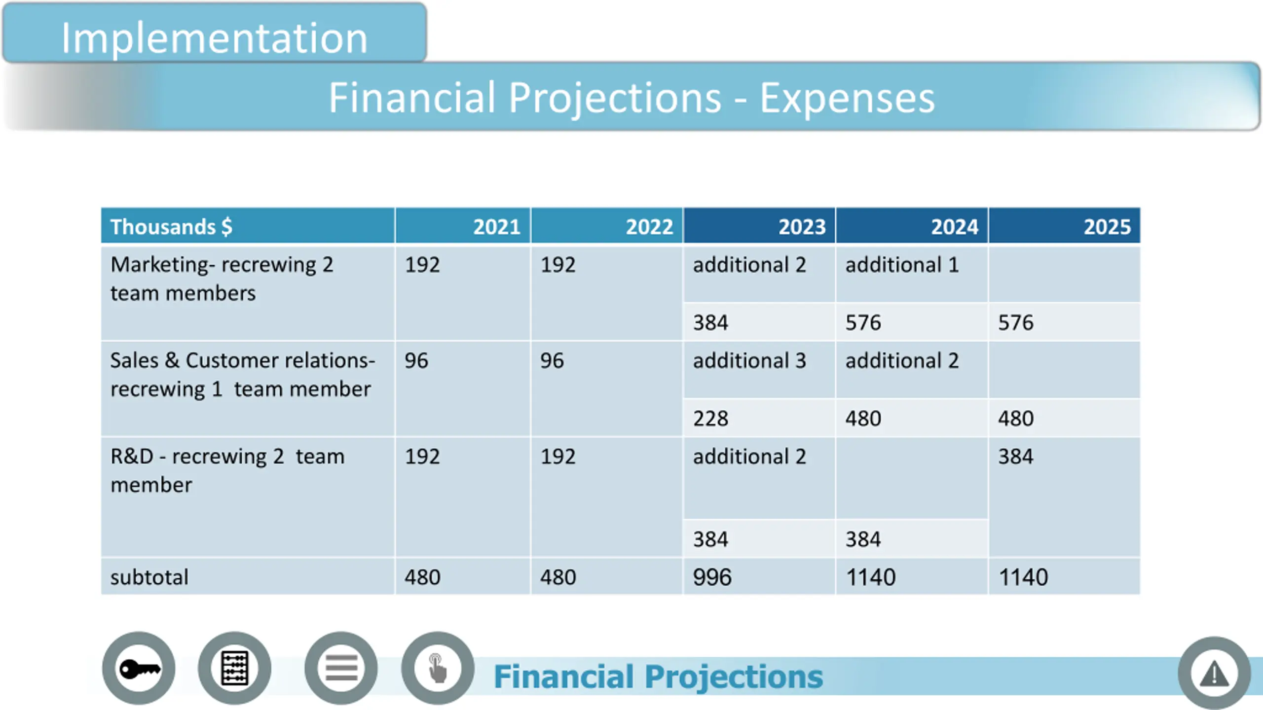 Implementation Financial Projections - Expenses Thousands $ 2021 2022 2023 2024 2025 Marketing- recrewing 2 team members 192 192 additional 2 additional 1 384 576 576 Sales & Customer relations- recrewing 1 team member 96 96 additional 3 additional 2 228 480 480 R&D - recrewing 2 team member 192 192 additional 2 384 384 996 384 1140 1140 subtotal 480 480 Financial Projections
