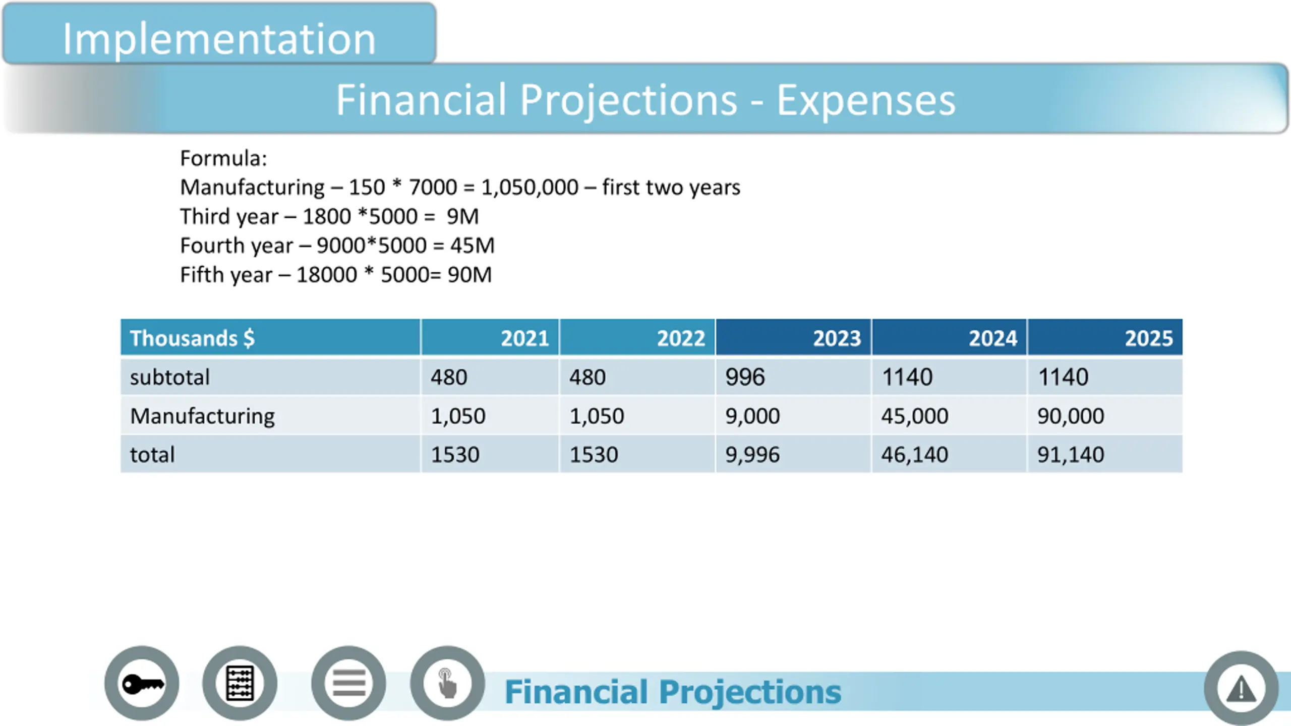 Implementation Financial Projections - Expenses Formula: Manufacturing 150 * 7000 = 1,050,000 first two years Third year 1800 *5000 = 9M Fourth year 9000*5000 = 45M Fifth year 18000 * 5000= 90M Thousands $ 2021 2022 2023 2024 2025 996 1140 1140 subtotal 480 480 Manufacturing 1,050 1,050 9,000 45,000 90,000 total 1530 1530 9,996 46,140 91,140 Financial Projections