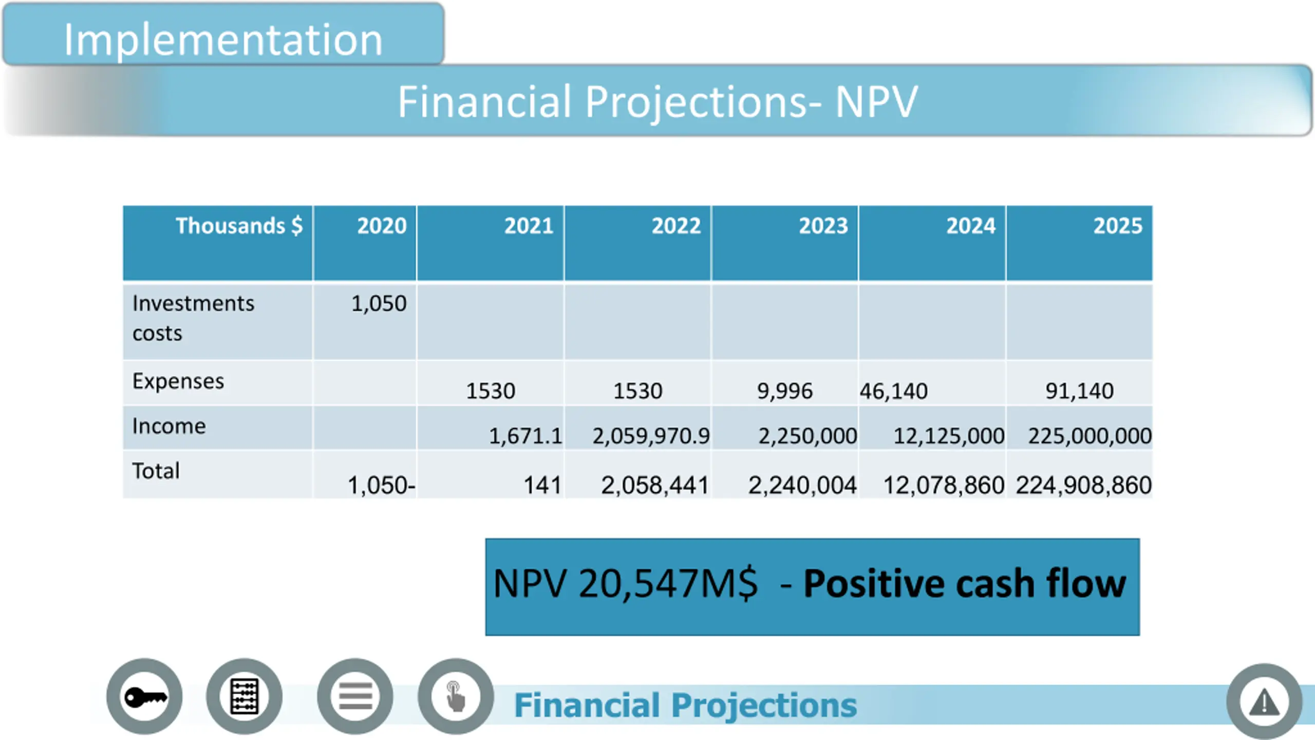 Implementation Financial Projections- NPV Thousands $ 2020 2021 2022 2023 2024 2025 Investments costs 1,050 Expenses 1530 1530 9,996 91,140 46,140 Income 1,671.1 2,059,970.9 2,250,000 12,125,000 225,000,000 Total 1,050 - 141 2,058,441 2,240,004 12,078,860 224,908,860 NPV 20,547M$ - Positive cash flow Financial Projections