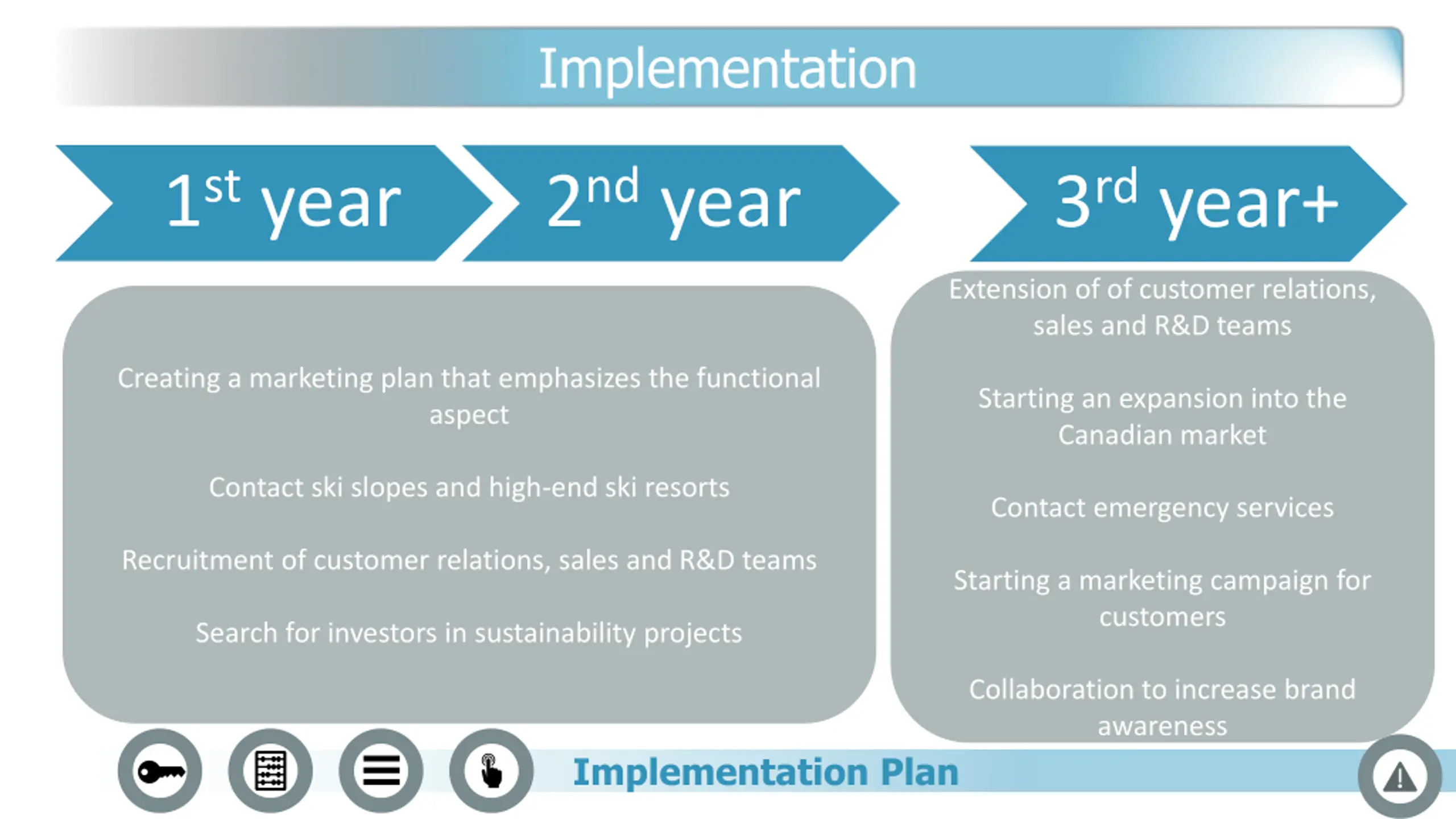 Implementation 1styear 2ndyear 3rdyear+ Extension of of customer relations, sales and R&D teams Creating a marketing plan that emphasizes the functional aspect Starting an expansion into the Canadian market Contact ski slopes and high-end ski resorts Contact emergency services Recruitment of customer relations, sales and R&D teams Starting a marketing campaign for customers Search for investors in sustainability projects Collaboration to increase brand awareness Implementation Plan