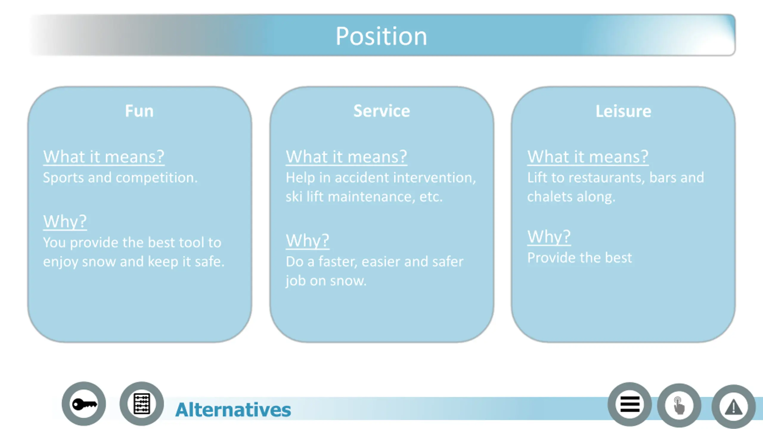 Position Fun Service Leisure What it means? Sports and competition. What it means? Help in accident intervention, ski lift maintenance, etc. What it means? Lift to restaurants, bars and chalets along. Why? You provide the best tool to enjoy snow and keep it safe. Why? Provide the best Why? Do a faster, easier and safer job on snow. Alternatives