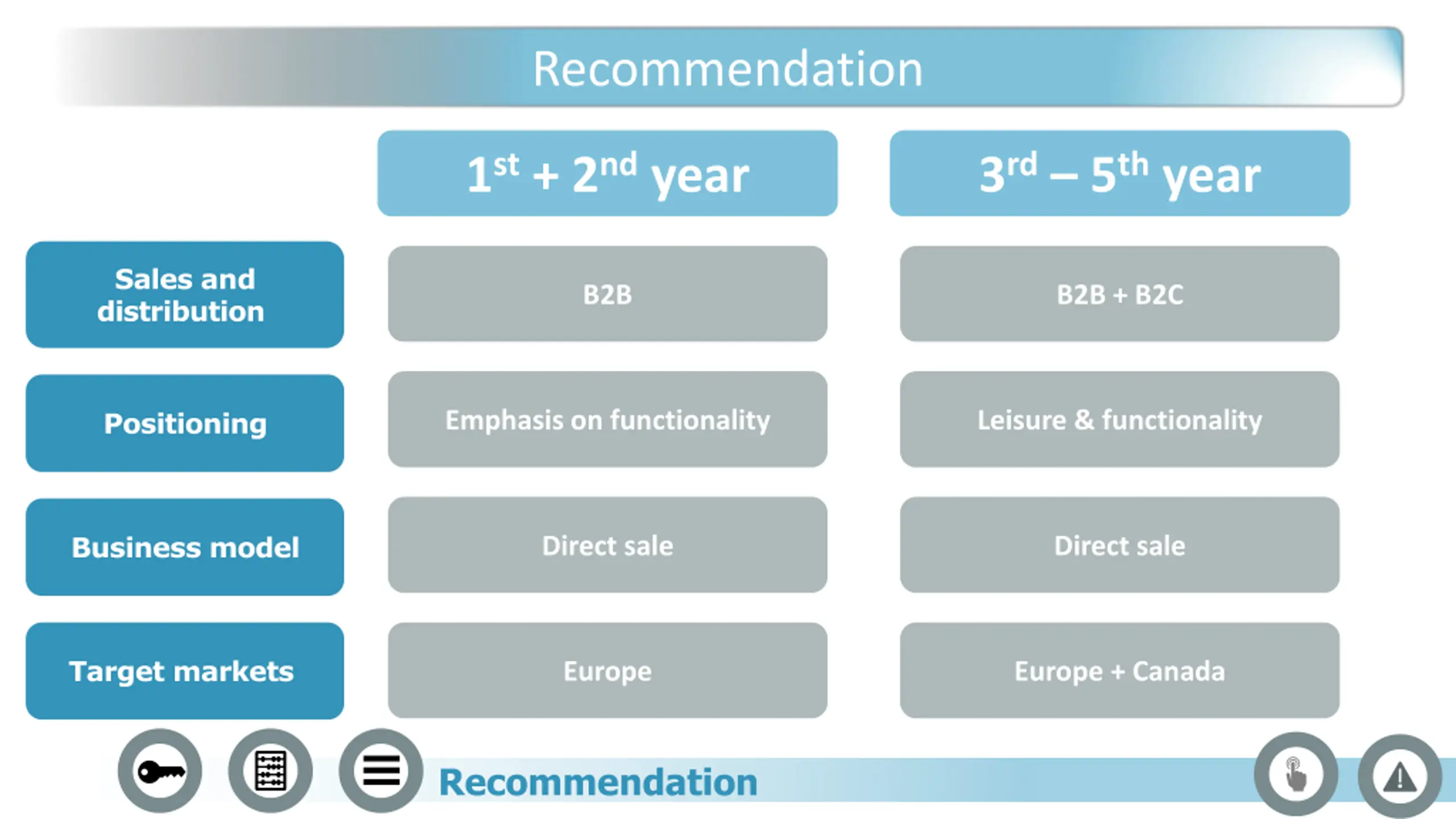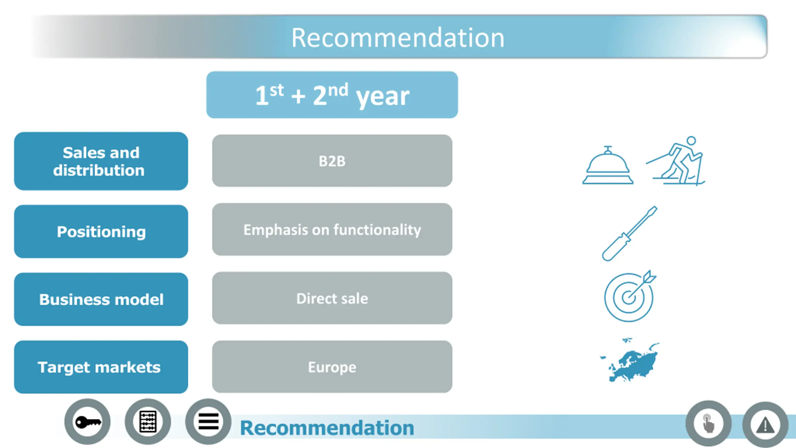 Recommendation 1st+ 2ndyear Sales and distribution B2B Positioning Emphasis on functionality Business model Direct sale Target markets Europe Recommendation