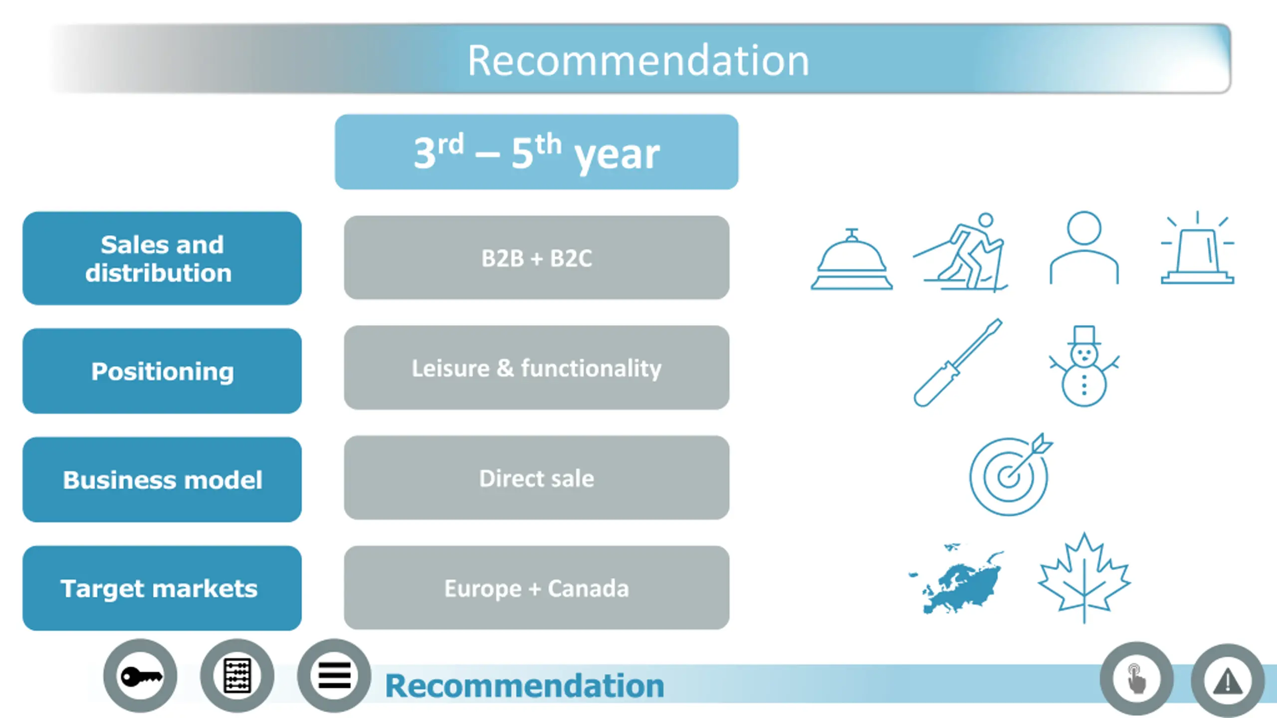 Recommendation 3rd 5thyear Sales and distribution B2B + B2C Positioning Leisure & functionality Business model Direct sale Target markets Europe + Canada Recommendation