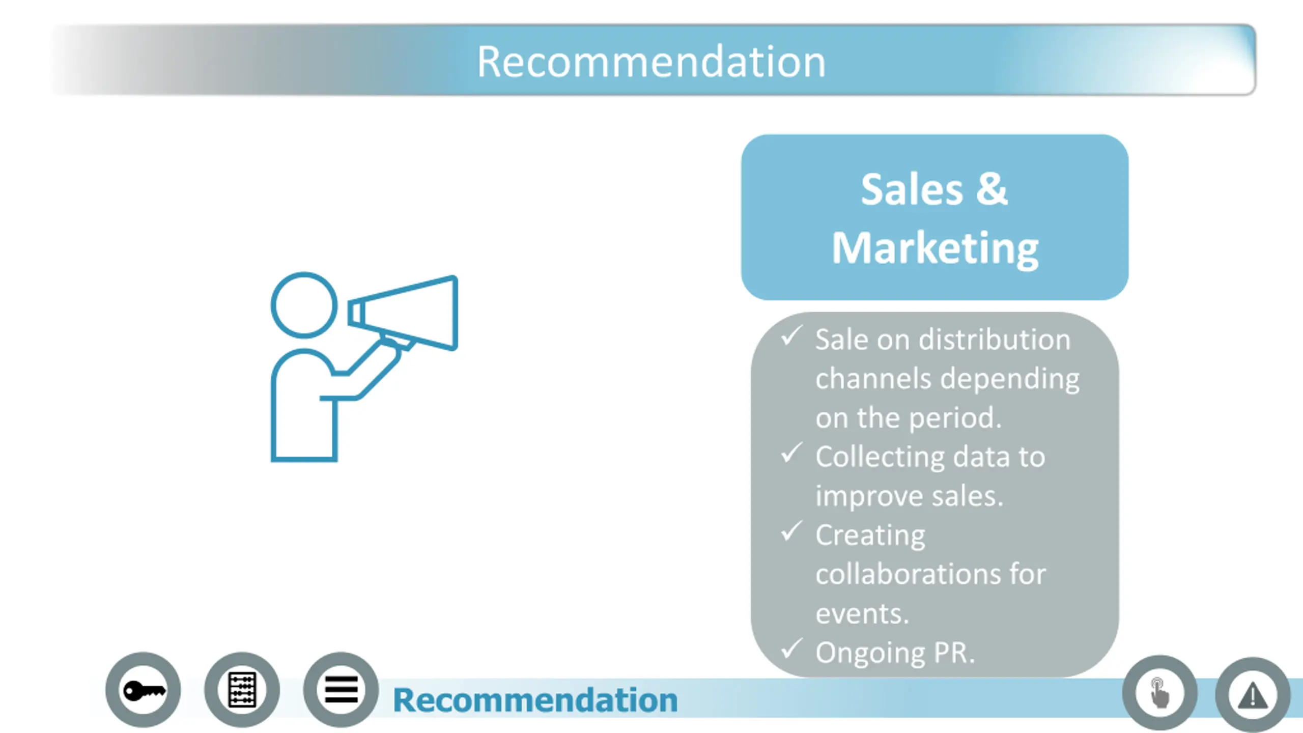 Recommendation Sales & Marketing Sale on distribution channels depending on the period. Collecting data to improve sales. Creating collaborations for events. Ongoing PR. Recommendation