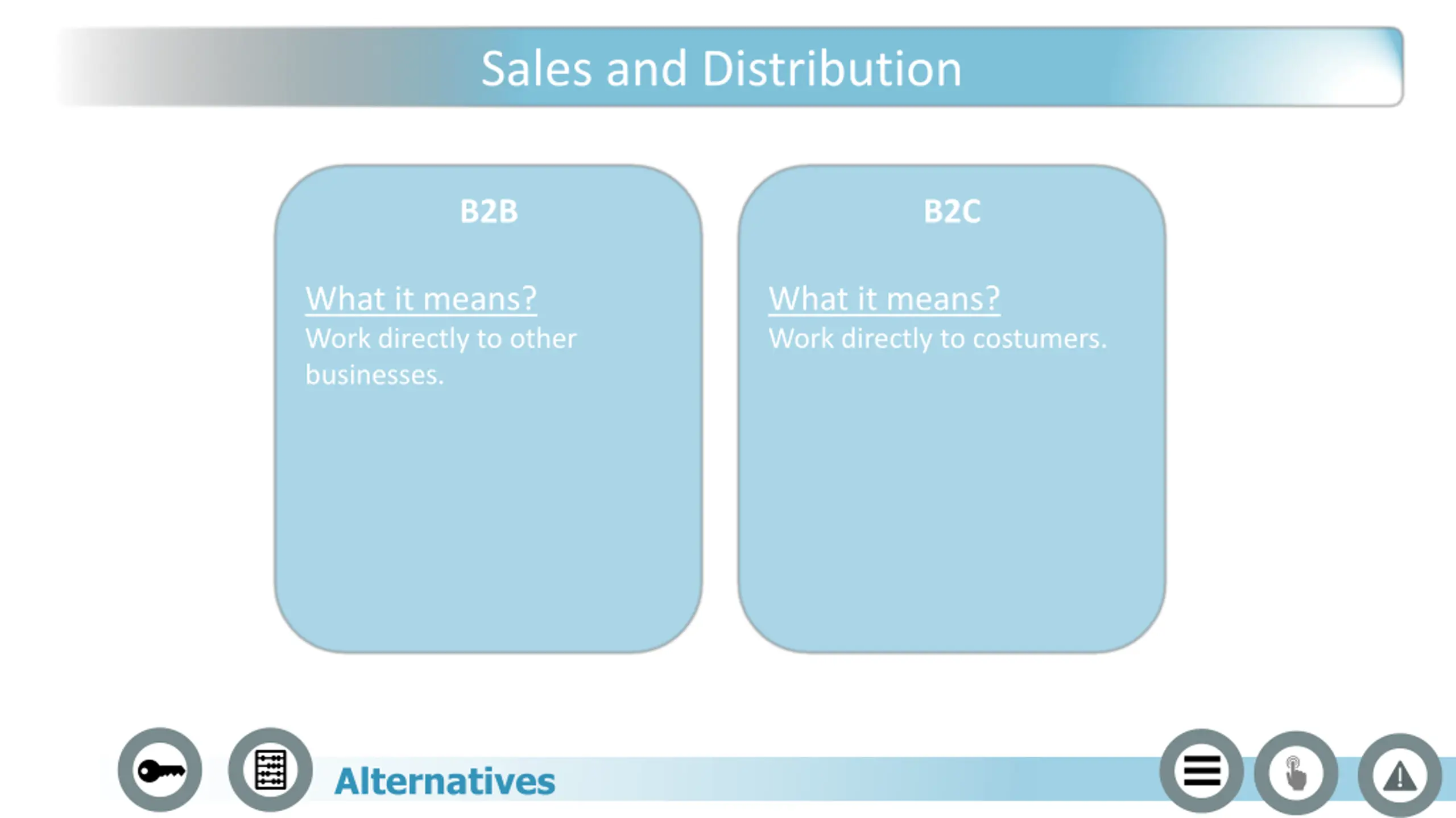 Sales and Distribution B2B B2C What it means? Work directly to other businesses. What it means? Work directly to costumers. Alternatives