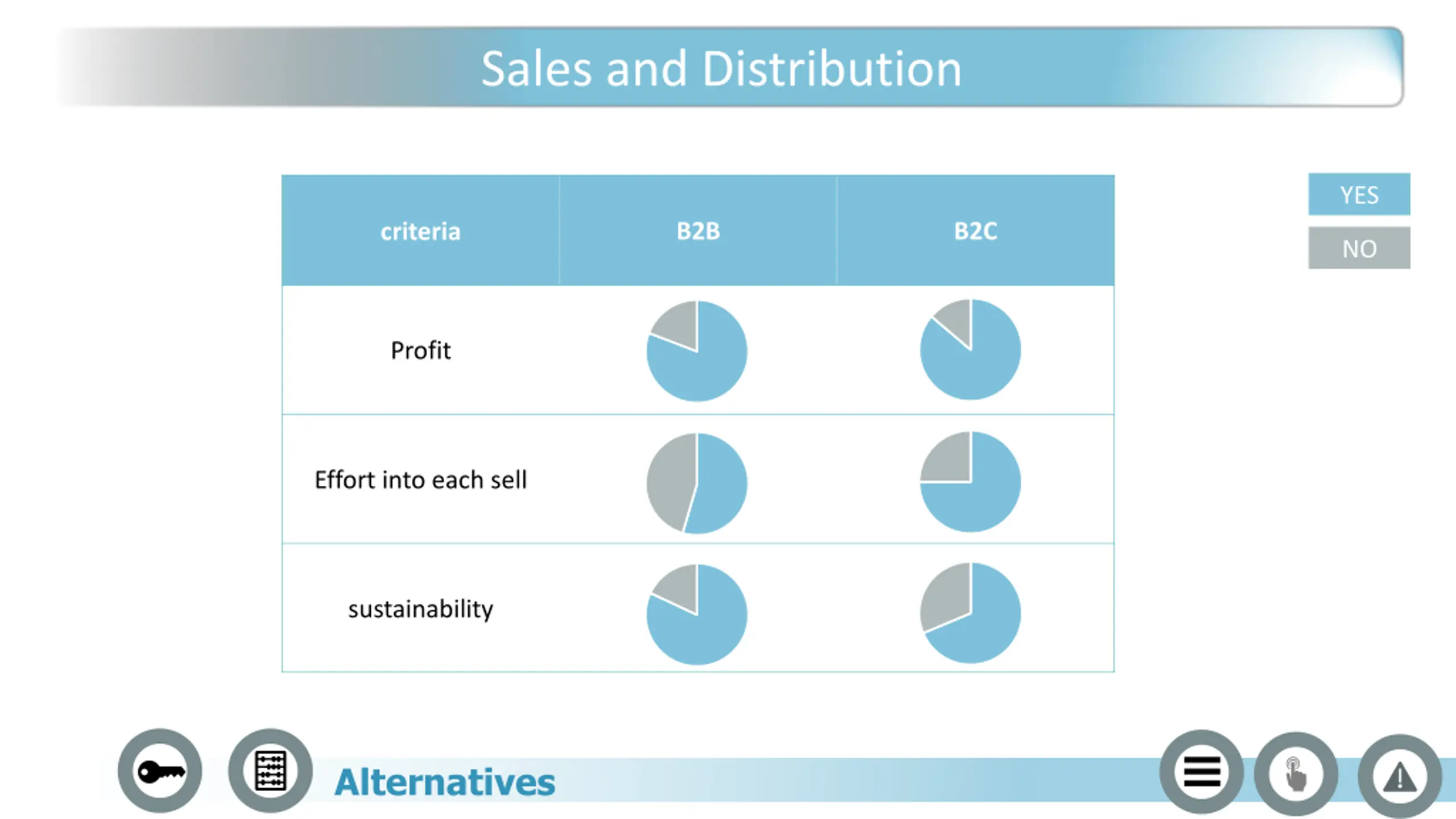 Sales and Distribution YES B2B B2C criteria NO Profit Effort into each sell sustainability Alternatives