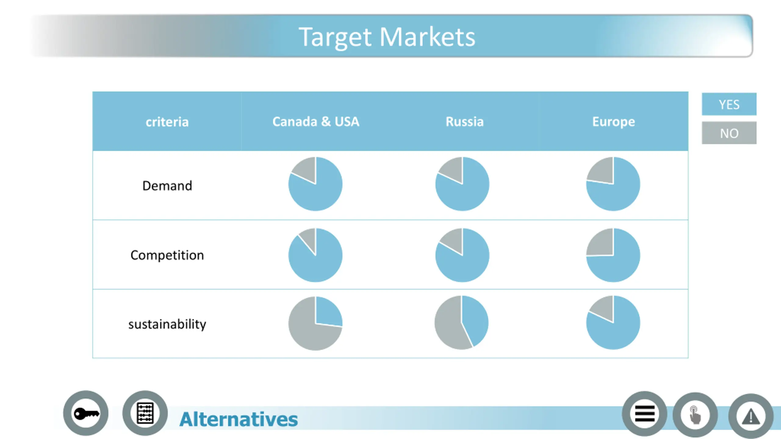 Target Markets YES Canada & USA Russia Europe criteria NO Demand Alternatives