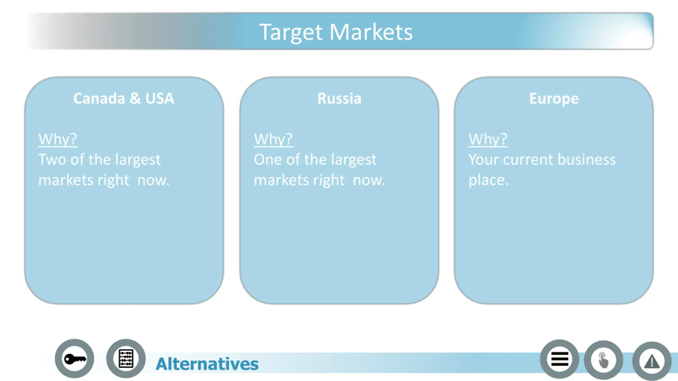 Target Markets Canada & USA Russia Europe Why? Two of the largest markets right now. Why? One of the largest markets right now. Why? Your current business place. Alternatives