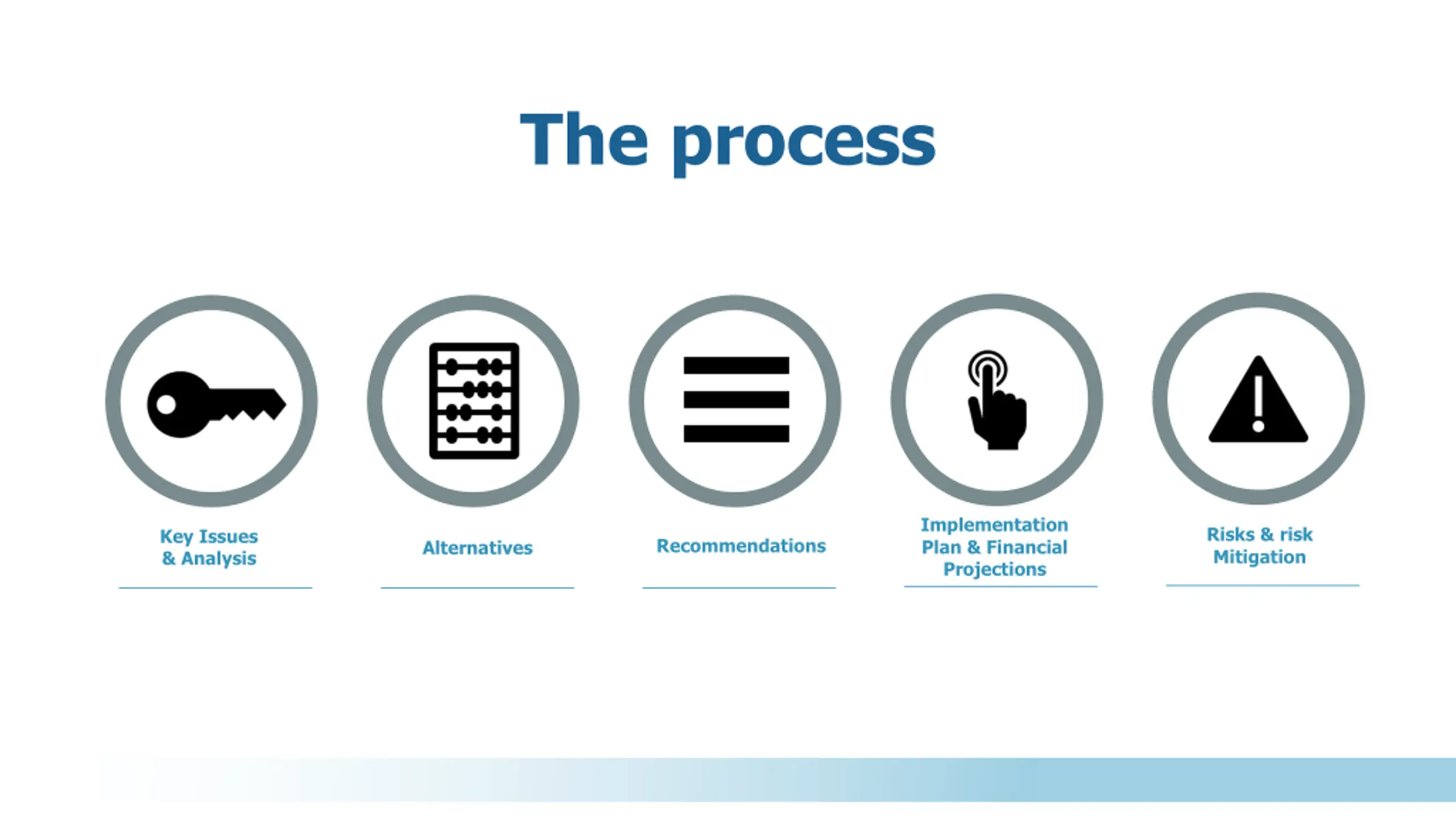 The process Implementation Plan & Financial Projections Risks & risk Mitigation Key Issues & Analysis Recommendations Alternatives