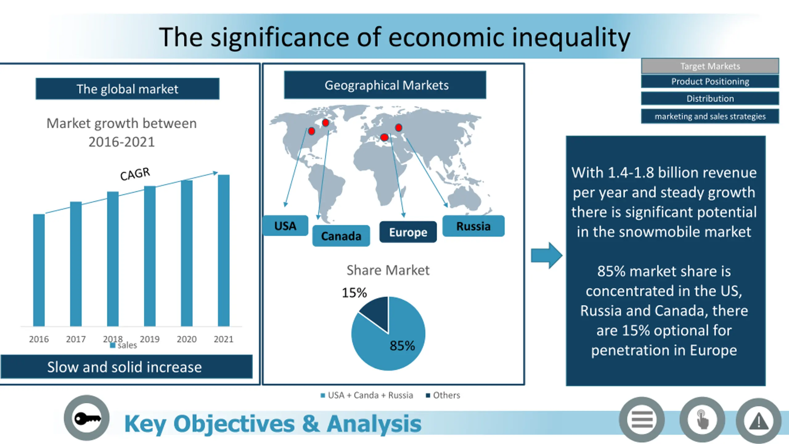 The significance of economic inequality Target Markets Product Positioning Geographical Markets The global market Distribution marketing and sales strategies Market growth between 2016-2021 With 1.4-1.8 billion revenue per year and steady growth there is significant potential in the snowmobile market USA Russia Europe Canada Share Market 85% market share is concentrated in the US, Russia and Canada, there are 15% optional for penetration in Europe 15% 2016 2017 2018 2019 2020 2021 85% sales Slow and solid increase USA + Canda + Russia Others Key Objectives & Analysis