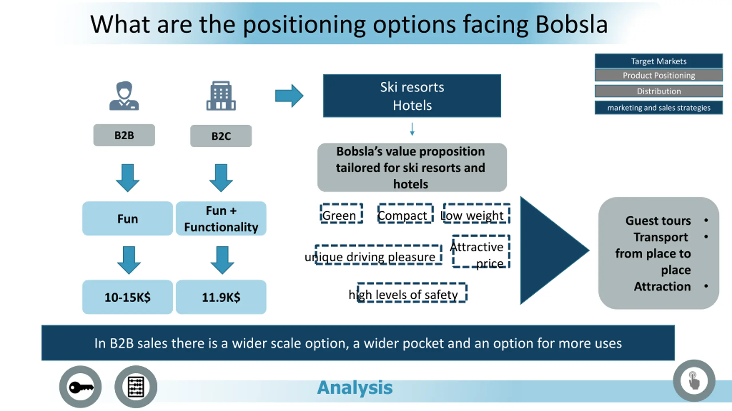 What are the positioning options facing Bobsla Target Markets Product Positioning Ski resorts Hotels Distribution marketing and sales strategies B2B B2C Bobsla s value proposition tailored for ski resorts and hotels Fun + Green Compact Low weight Fun Guest tours Transport from place to Functionality Attractive price unique driving pleasure place Attraction high levels of safety 10-15K$ 11.9K$ In B2B sales there is a wider scale option, a wider pocket and an option for more uses Analysis