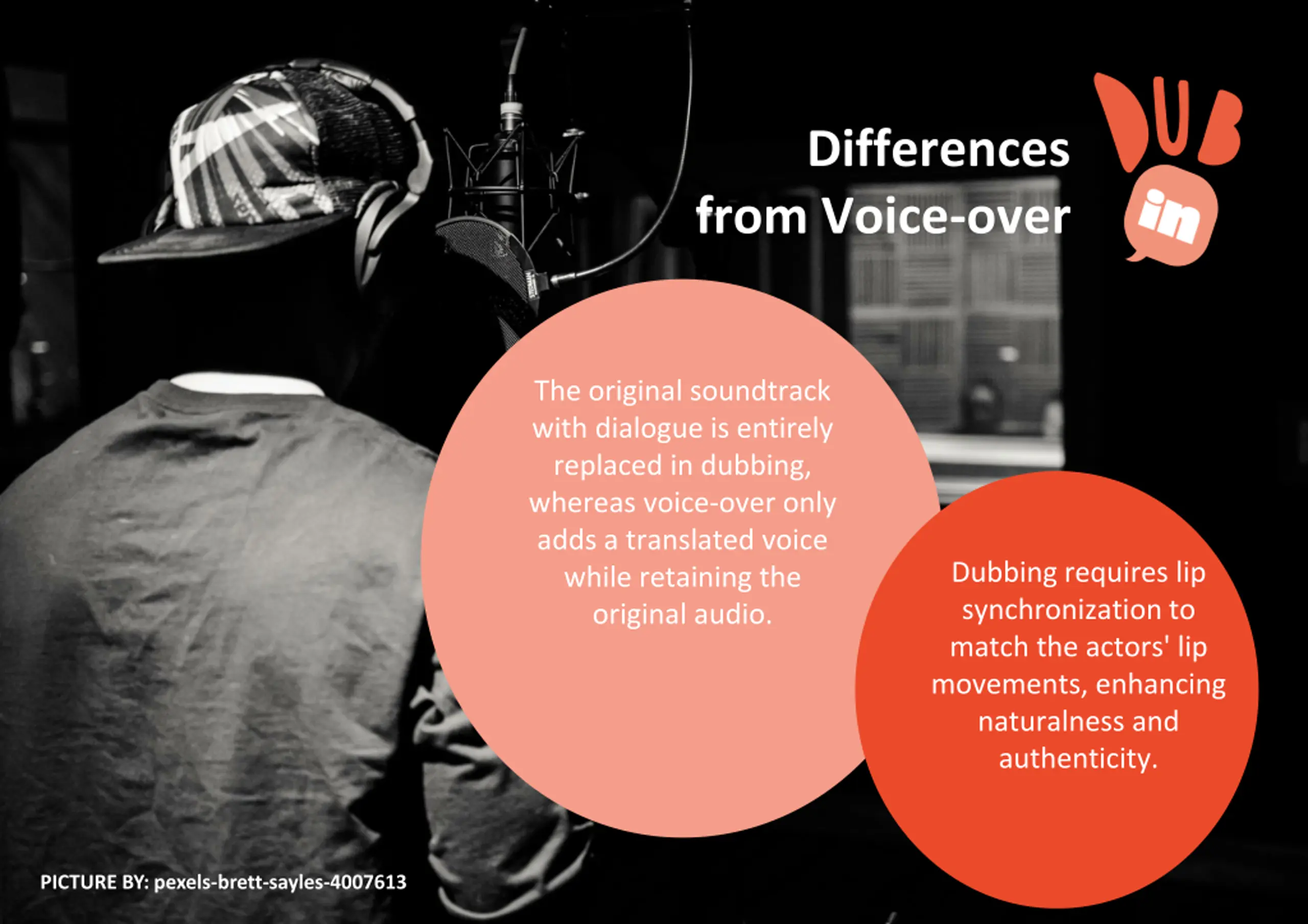 Differences from Voice-over The original soundtrack with dialogue is entirely replaced in dubbing, whereas voice-over only adds a translated voice while retaining the original audio. Dubbing requires lip synchronization to match the actors' lip movements, enhancing naturalness and authenticity. PICTURE BY: pexels-brett-sayles-4007613
