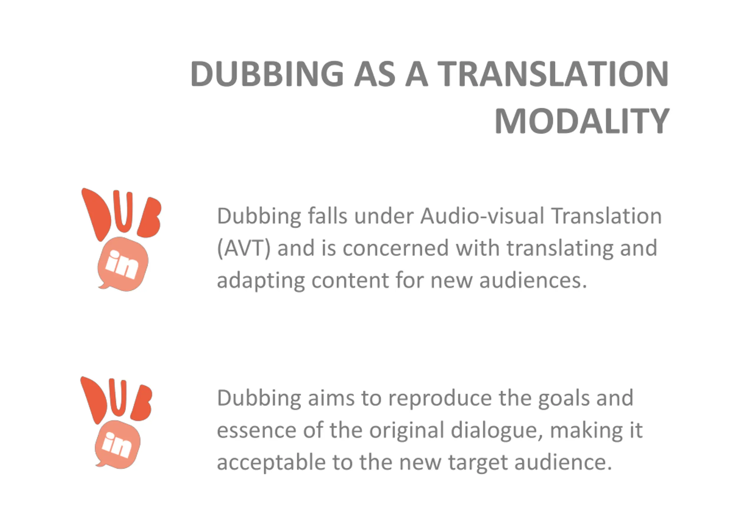 DUBBING AS A TRANSLATION MODALITY Dubbing falls under Audio-visual Translation (AVT) and is concerned with translating and adapting content for new audiences. Dubbing aims to reproduce the goals and essence of the original dialogue, making it acceptable to the new target audience.