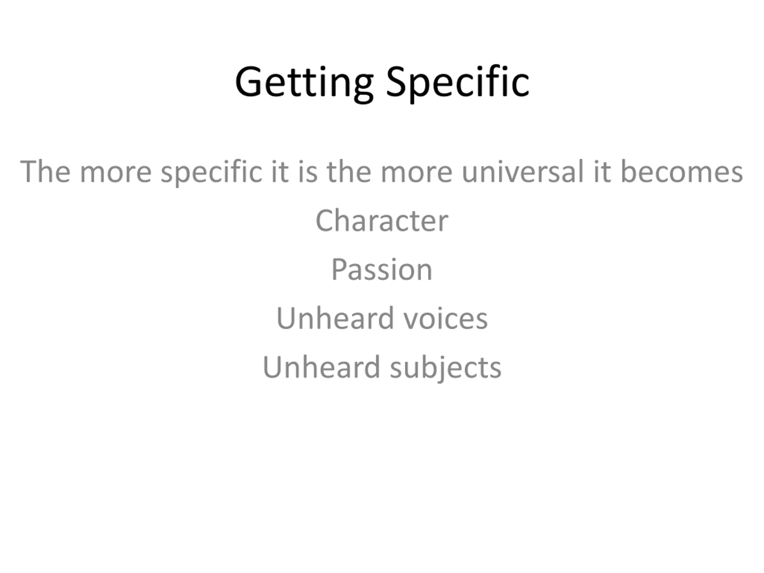 Getting Specific The more specific it is the more universal it becomes Character Passion Unheard voices Unheard subjects
