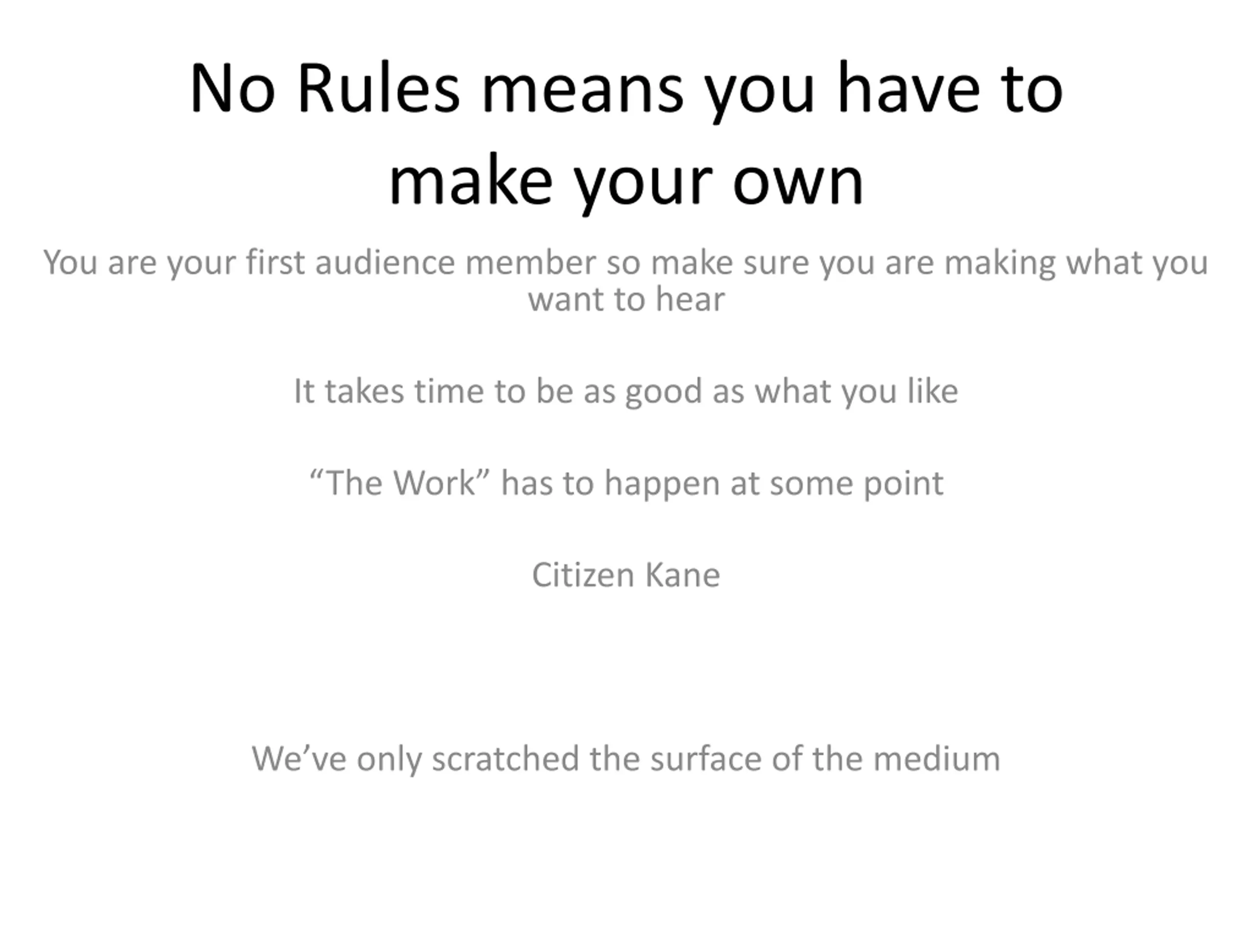 No Rules means you have to make your own You are your first audience member so make sure you are making what you want to hear It takes time to be as good as what you like The Work has to happen at some point Citizen Kane We ve only scratched the surface of the medium