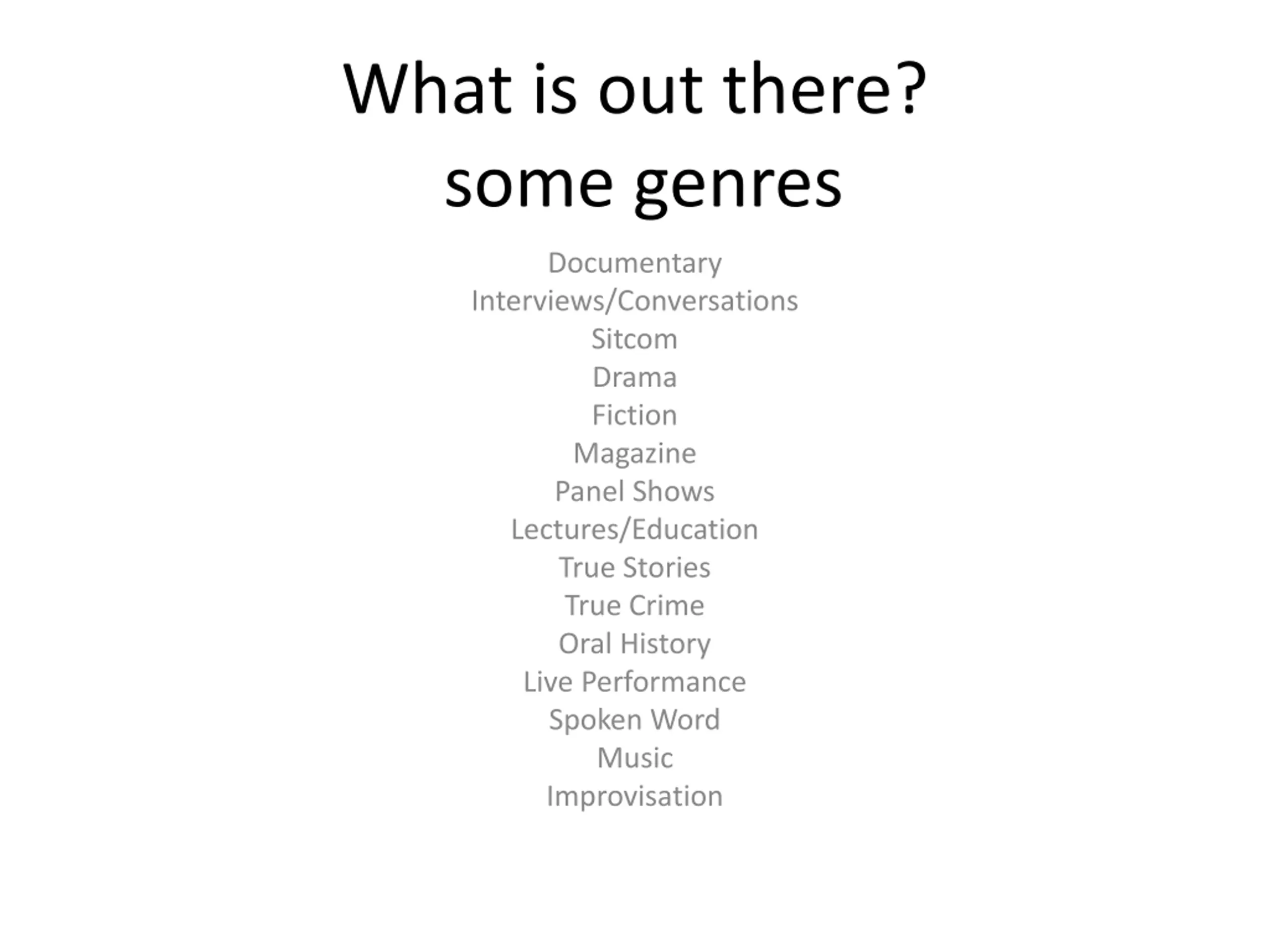 What is out there? some genres Documentary Interviews/Conversations Sitcom Drama Fiction Magazine Panel Shows Lectures/Education True Stories True Crime Oral History Live Performance Spoken Word Music Improvisation