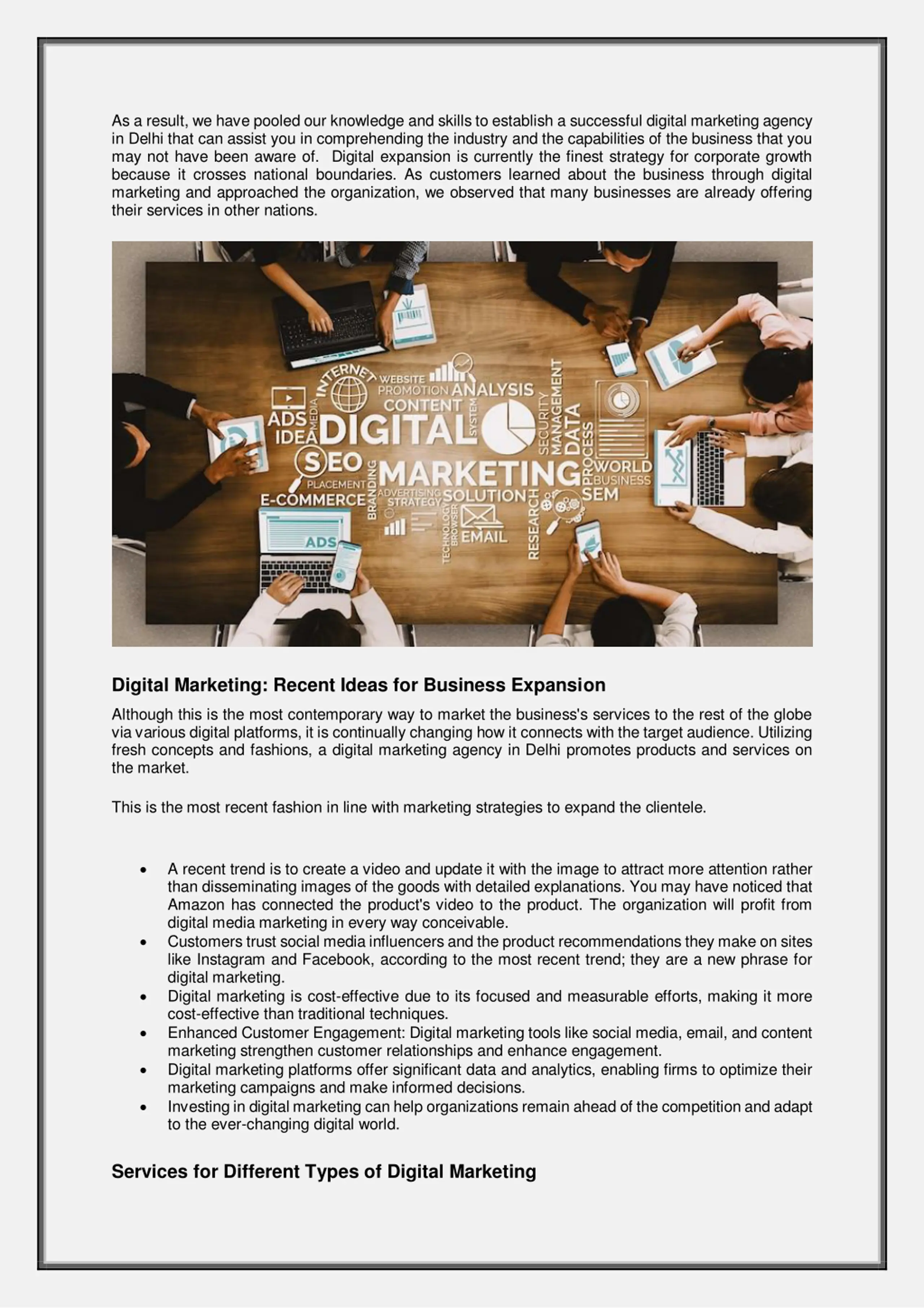 As a result, we have pooled our knowledge and skills to establish a successful digital marketing agency in Delhi that can assist you in comprehending the industry and the capabilities of the business that you may not have been aware of. Digital expansion is currently the finest strategy for corporate growth because it crosses national boundaries. As customers learned about the business through digital marketing and approached the organization, we observed that many businesses are already offering their services in other nations. Digital Marketing: Recent Ideas for Business Expansion Although this is the most contemporary way to market the business's services to the rest of the globe via various digital platforms, it is continually changing how it connects with the target audience. Utilizing fresh concepts and fashions, a digital marketing agency in Delhipromotes products and services on the market. This is the most recent fashion in line with marketing strategies to expand the clientele. A recent trend is to create a video and update it with the image to attract more attention rather than disseminating images of the goods with detailed explanations. You may have noticed that Amazon has connected the product's video to the product. The organization will profit from digital media marketing in every way conceivable. Customers trust social media influencers and the product recommendations they make on sites like Instagram and Facebook, according to the most recent trend; they are a new phrase for digital marketing. Digital marketing is cost-effective due to its focused and measurable efforts, making it more cost-effective than traditional techniques. Enhanced Customer Engagement: Digital marketing tools like social media, email, and content marketing strengthen customer relationships and enhance engagement. Digital marketing platforms offer significant data and analytics, enabling firms to optimize their marketing campaigns and make informed decisions. Investing in digital marketing can help organizations remain ahead of the competition and adapt to the ever-changing digital world. Services for Different Types of Digital Marketing