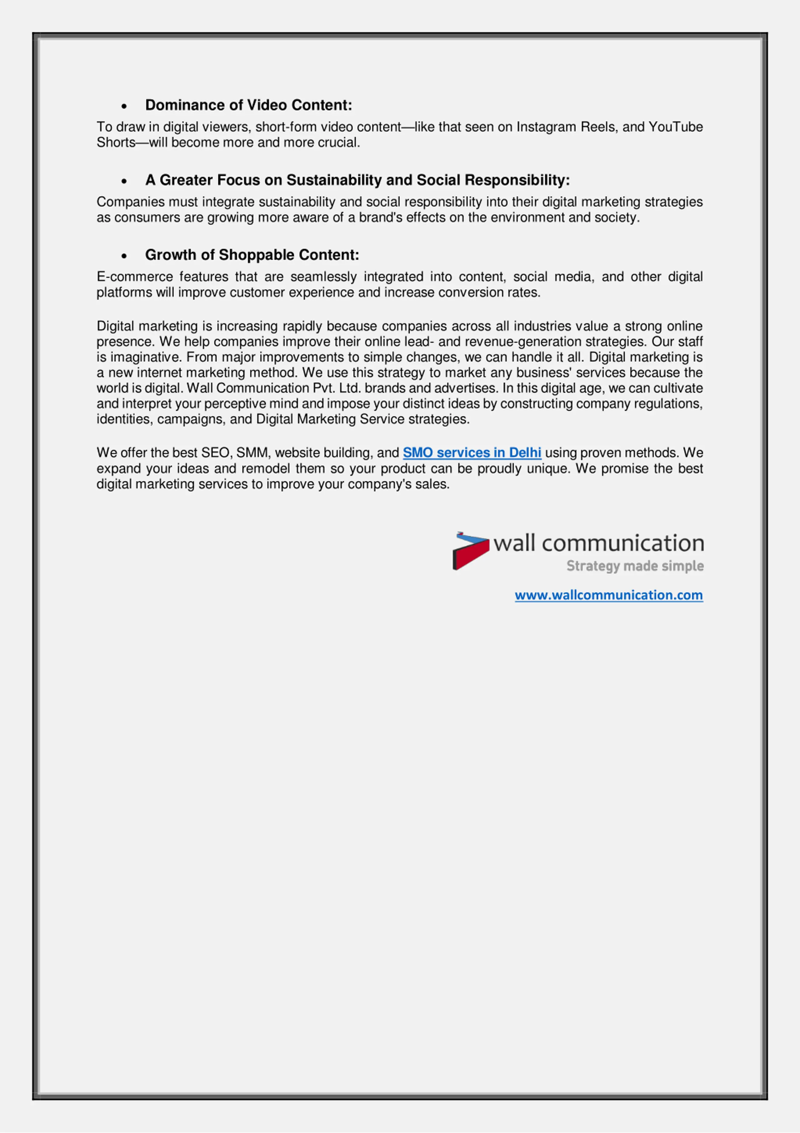 Dominance of Video Content: To draw in digital viewers, short-form video content like that seen on Instagram Reels, and YouTube Shorts will become more and more crucial. A Greater Focus on Sustainability and Social Responsibility: Companies must integrate sustainability and social responsibility into their digital marketing strategies as consumers are growing more aware of a brand's effects on the environment and society. Growth of Shoppable Content: E-commerce features that are seamlessly integrated into content, social media, and other digital platforms will improve customer experience and increase conversion rates. Digital marketing is increasing rapidly because companies across all industries value a strong online presence. We help companies improve their online lead- and revenue-generation strategies. Our staff is imaginative. From major improvements to simple changes, we can handle it all. Digital marketing is a new internet marketing method. We use this strategy to market any business' services because the world is digital. Wall Communication Pvt. Ltd. brands and advertises. In this digital age, we can cultivate and interpret your perceptive mind and impose your distinct ideas by constructing company regulations, identities, campaigns, and Digital Marketing Service strategies. We offer the best SEO, SMM, website building, and SMO services in Delhi using proven methods. We expand your ideas and remodel them so your product can be proudly unique. We promise the best digital marketing services to improve your company's sales. www.wallcommunication.com