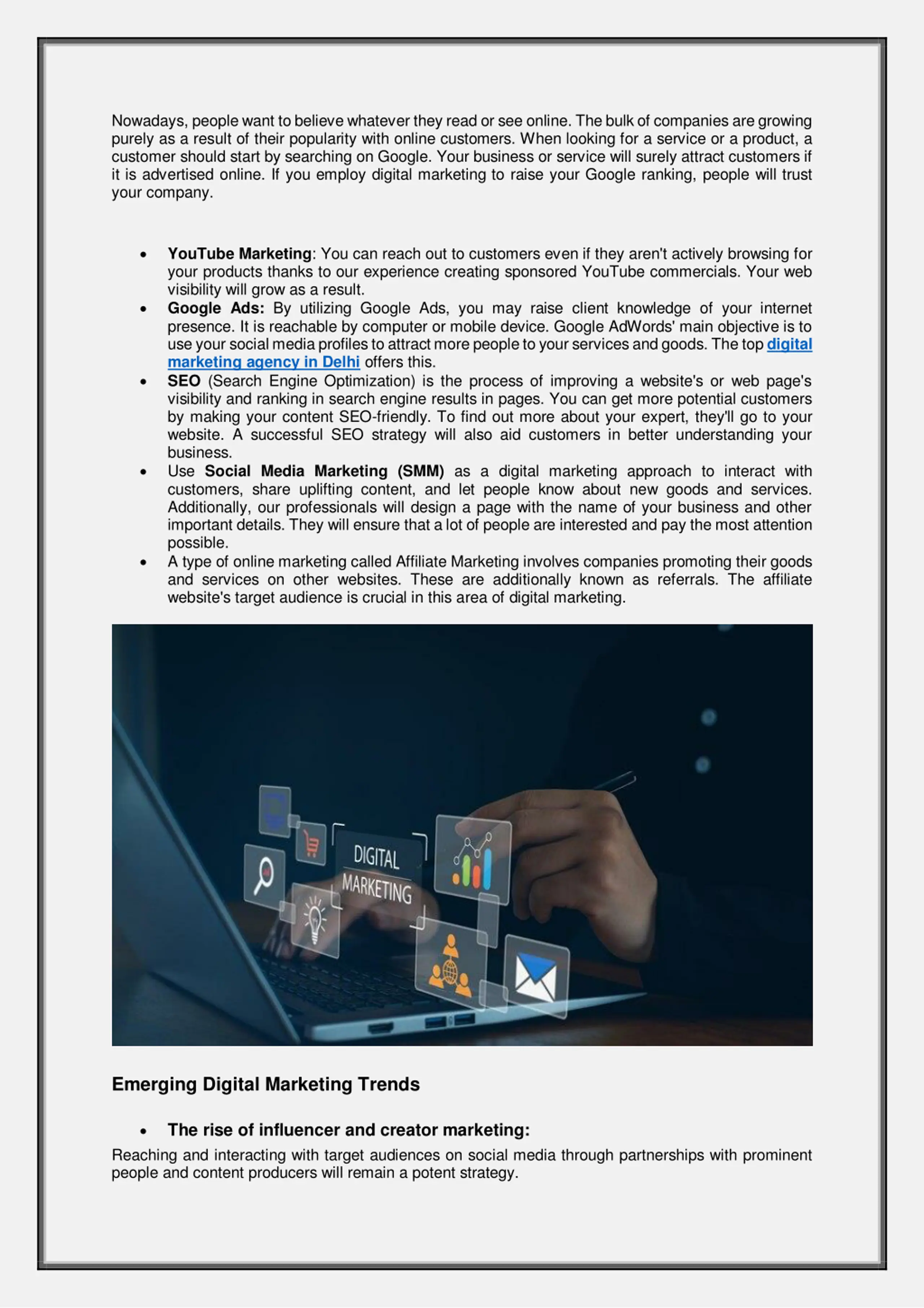 Nowadays, people want to believe whatever they read or see online. The bulk of companies are growing purely as a result of their popularity with online customers. When looking for a service or a product, a customer should start by searching on Google. Your business or service will surely attract customers if it is advertised online. If you employ digital marketing to raise your Google ranking, people will trust your company. YouTube Marketing: You can reach out to customers even if they aren't actively browsing for your products thanks to our experience creating sponsored YouTube commercials. Your web visibility will grow as a result. Google Ads: By utilizing Google Ads, you may raise client knowledge of your internet presence. It is reachable by computer or mobile device. Google AdWords' main objective is to use your social media profiles to attract more people to your services and goods. The top digital marketing agency in Delhi offers this. SEO (Search Engine Optimization) is the process of improving a website's or web page's visibility and ranking in search engine results in pages. You can get more potential customers by making your content SEO-friendly. To find out more about your expert, they'll go to your website. A successful SEO strategy will also aid customers in better understanding your business. Use Social Media Marketing (SMM) as a digital marketing approach to interact with customers, share uplifting content, and let people know about new goods and services. Additionally, our professionals will design a page with the name of your business and other important details. They will ensure that a lot of people are interested and pay the most attention possible. A type of online marketing called Affiliate Marketing involves companies promoting their goods and services on other websites. These are additionally known as referrals. The affiliate website's target audience is crucial in this area of digital marketing. Emerging Digital Marketing Trends The rise of influencer and creator marketing: Reaching and interacting with target audiences on social media through partnerships with prominent people and content producers will remain a potent strategy.