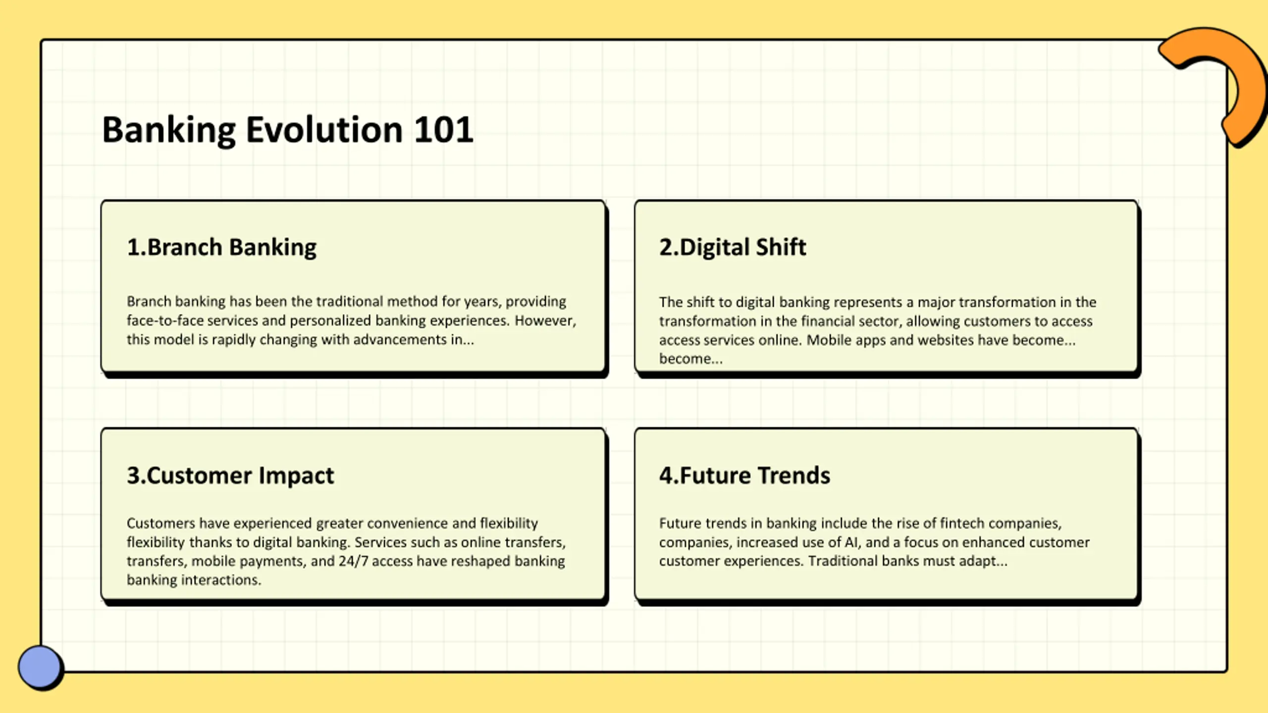 Banking Evolution 101 1.Branch Banking 2.Digital Shift Branch banking has been the traditional method for years, providing face-to-face services and personalized banking experiences. However, this model is rapidly changing with advancements in... The shift to digital banking represents a major transformation in the transformation in the financial sector, allowing customers to access access services online. Mobile apps and websites have become... become... 3.Customer Impact 4.Future Trends Customers have experienced greater convenience and flexibility flexibility thanks to digital banking. Services such as online transfers, transfers, mobile payments, and 24/7 access have reshaped banking banking interactions. Future trends in banking include the rise of fintech companies, companies, increased use of AI, and a focus on enhanced customer customer experiences. Traditional banks must adapt...