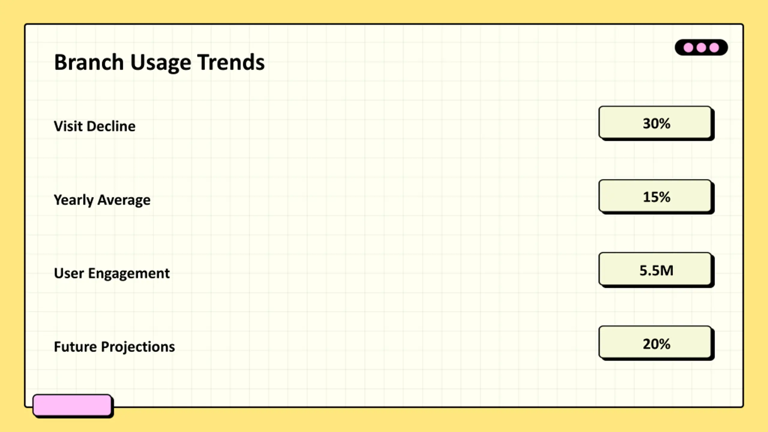 Branch Usage Trends 30% Visit Decline 15% Yearly Average 5.5M User Engagement 20% Future Projections