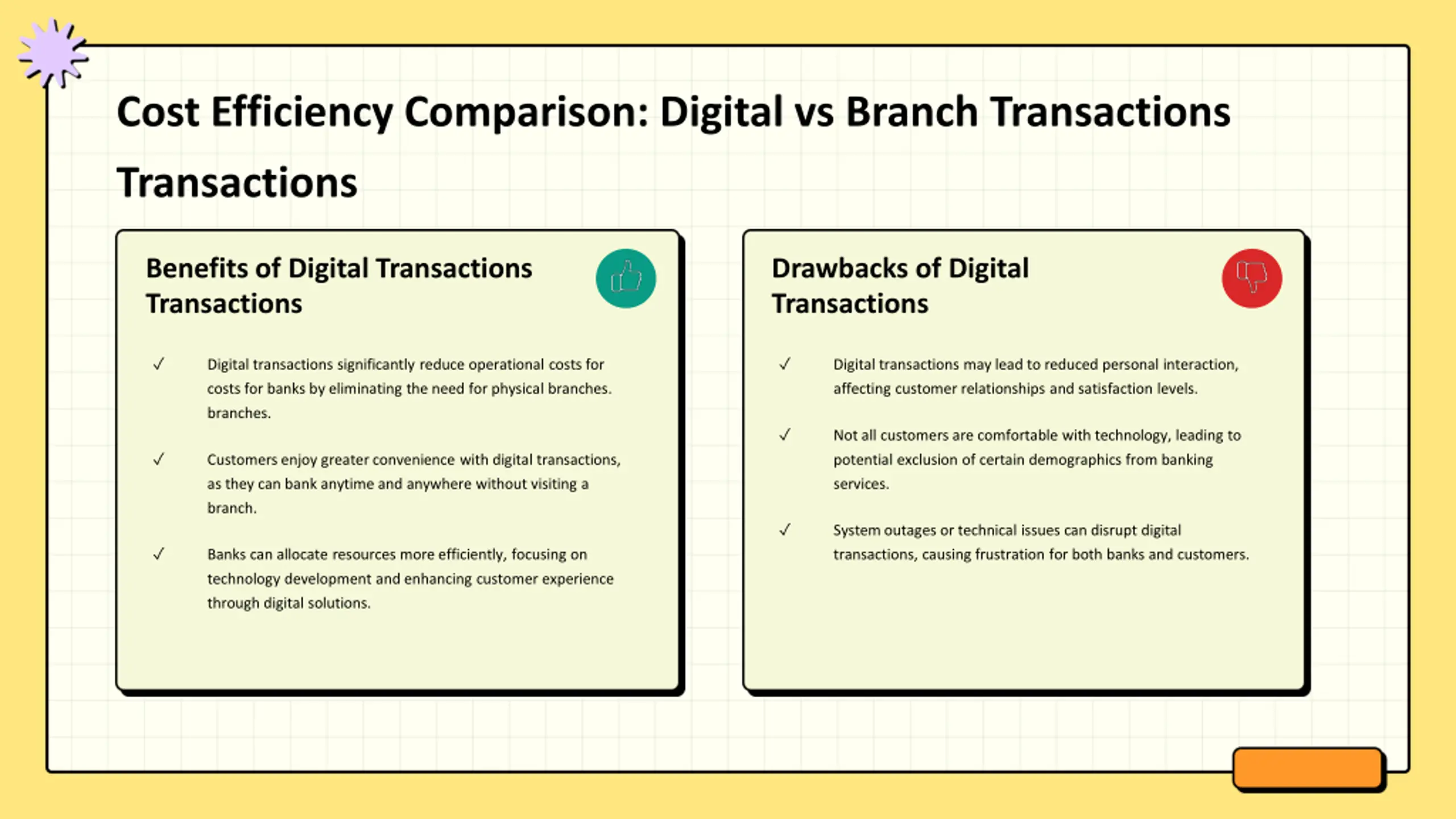 Cost Efficiency Comparison: Digital vs Branch Transactions Transactions Benefits of Digital Transactions Transactions Drawbacks of Digital Transactions Digital transactions significantly reduce operational costs for costs for banks by eliminating the need for physical branches. branches. Digital transactions may lead to reduced personal interaction, affecting customer relationships and satisfaction levels. Not all customers are comfortable with technology, leading to potential exclusion of certain demographics from banking services. Customers enjoy greater convenience with digital transactions, as they can bank anytime and anywhere without visiting a branch. System outages or technical issues can disrupt digital transactions, causing frustration for both banks and customers. Banks can allocate resources more efficiently, focusing on technology development and enhancing customer experience through digital solutions.