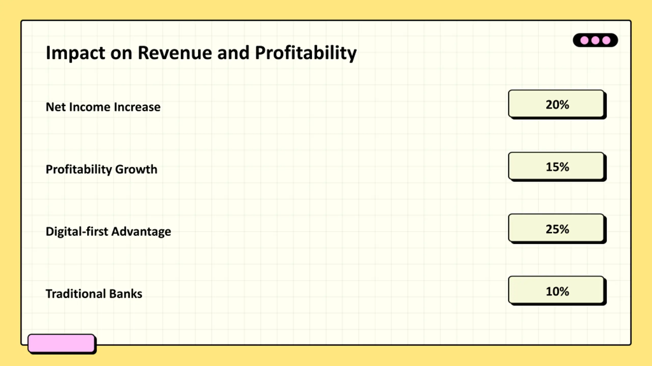 Impact on Revenue and Profitability 20% Net Income Increase 15% Profitability Growth 25% Digital-first Advantage 10% Traditional Banks