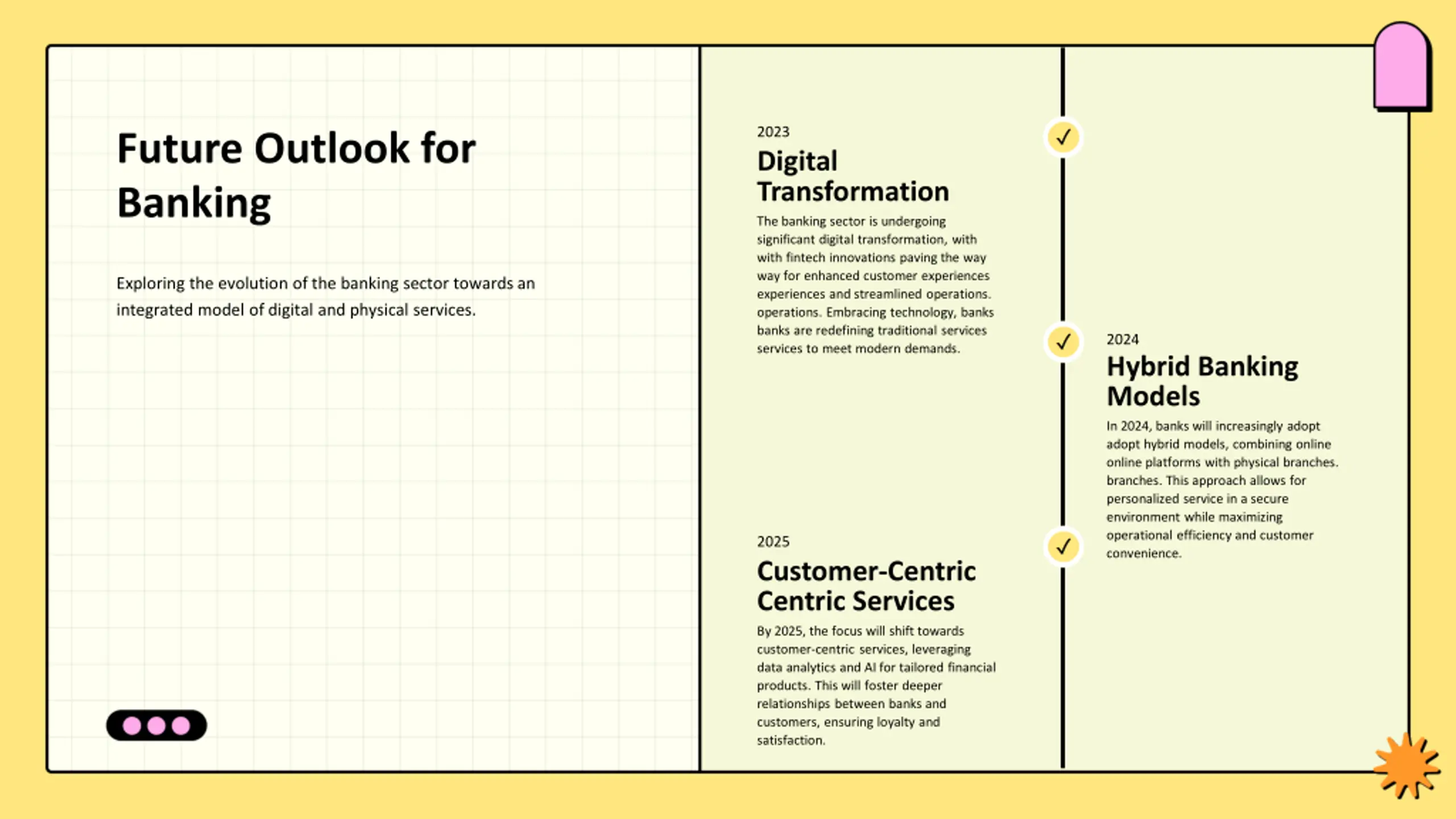 2023 Digital Transformation The banking sector is undergoing significant digital transformation, with with fintech innovations paving the way way for enhanced customer experiences experiences and streamlined operations. operations. Embracing technology, banks banks are redefining traditional services services to meet modern demands. Future Outlook for Banking Exploring the evolution of the banking sector towards an integrated model of digital and physical services. 2024 Hybrid Banking Models In 2024, banks will increasingly adopt adopt hybrid models, combining online online platforms with physical branches. branches. This approach allows for personalized service in a secure environment while maximizing operational efficiency and customer convenience. 2025 Customer- Centric Services By 2025, the focus will shift towards customer-centric services, leveraging data analytics and AI for tailored financial products. This will foster deeper relationships between banks and customers, ensuring loyalty and satisfaction. Centric