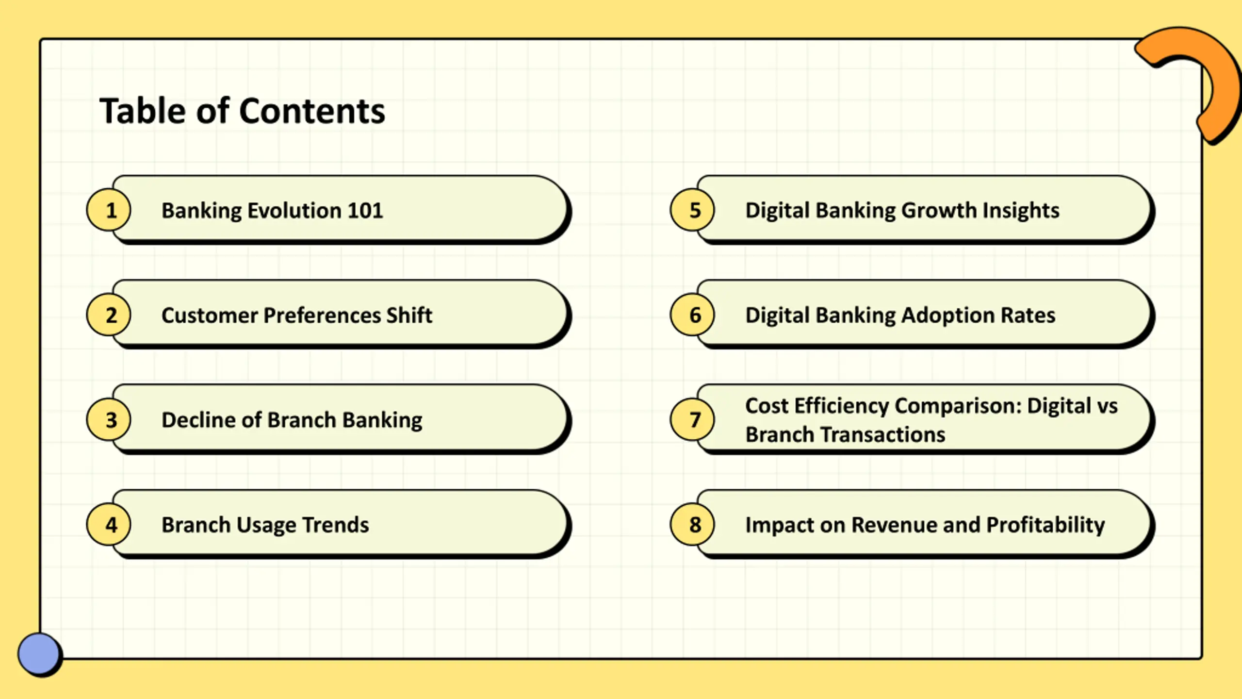 Table of Contents 5 Digital Banking Growth Insights 1 Banking Evolution 101 6 Digital Banking Adoption Rates 2 Customer Preferences Shift Cost Efficiency Comparison: Digital vs Branch Transactions Decline of Branch Banking 7 3 Branch Usage Trends 8 Impact on Revenue and Profitability 4