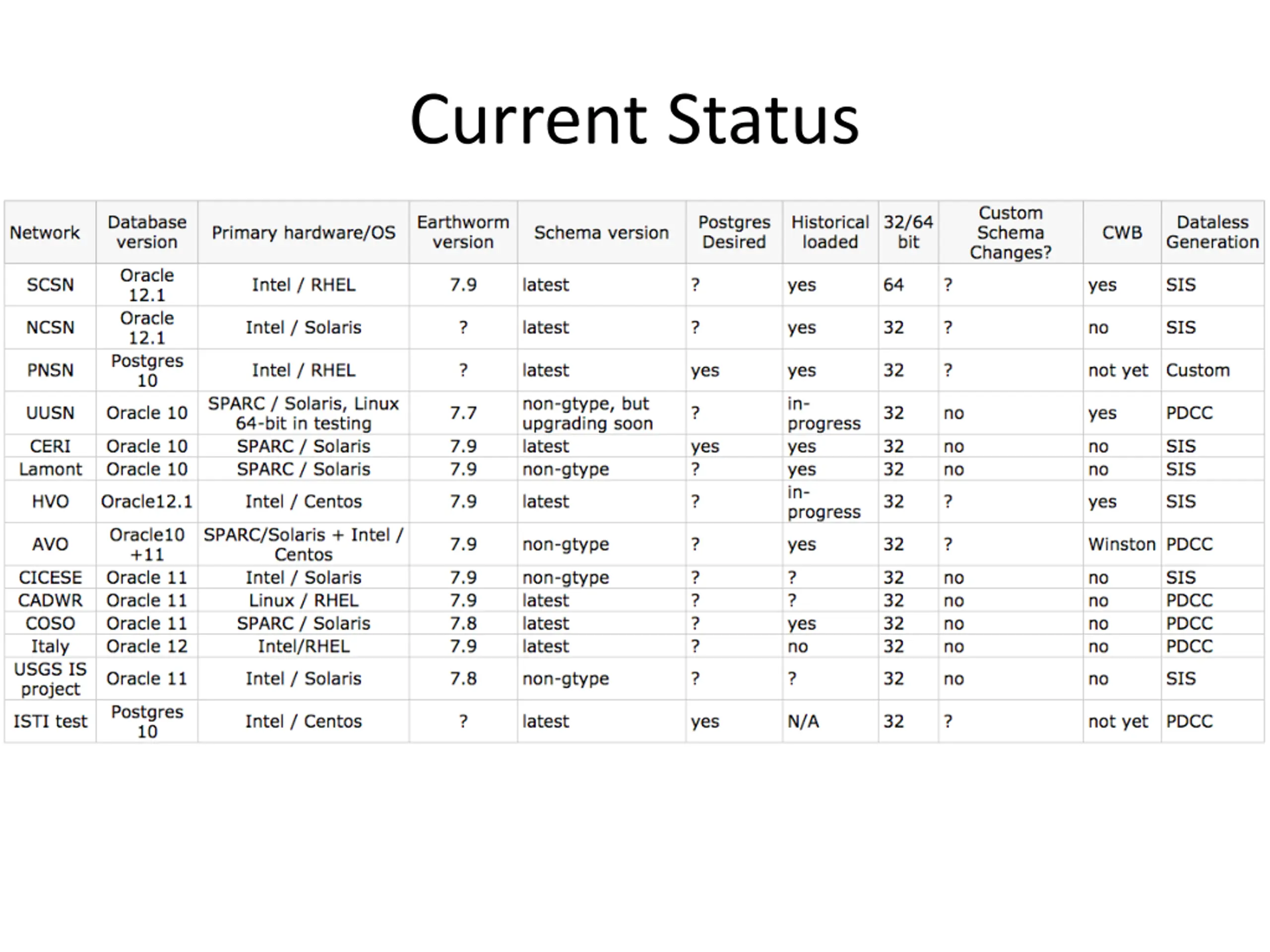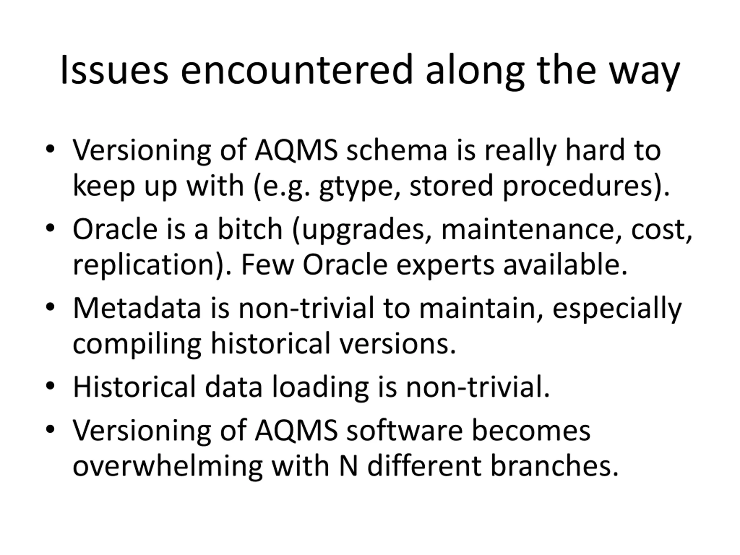 Issues encountered along the way Versioning of AQMS schema is really hard to keep up with (e.g. gtype, stored procedures). Oracle is a bitch (upgrades, maintenance, cost, replication). Few Oracle experts available. Metadata is non-trivial to maintain, especially compiling historical versions. Historical data loading is non-trivial. Versioning of AQMS software becomes overwhelming with N different branches.