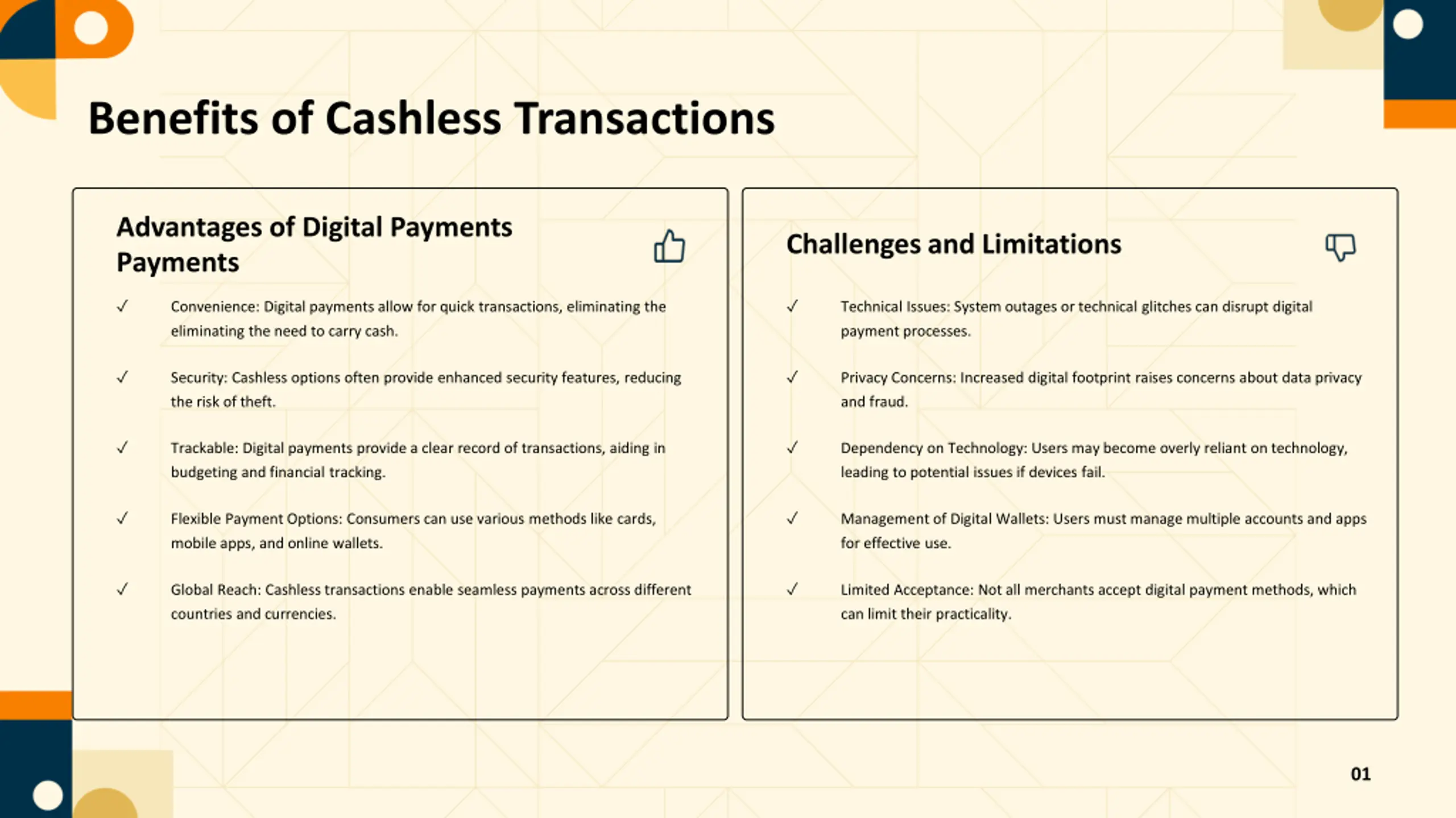 Benefits of Cashless Transactions Advantages of Digital Payments Payments Challenges and Limitations Convenience: Digital payments allow for quick transactions, eliminating the eliminating the need to carry cash. Technical Issues: System outages or technical glitches can disrupt digital payment processes. Security: Cashless options often provide enhanced security features, reducing the risk of theft. Privacy Concerns: Increased digital footprint raises concerns about data privacy and fraud. Trackable: Digital payments provide a clear record of transactions, aiding in budgeting and financial tracking. Dependency on Technology: Users may become overly reliant on technology, leading to potential issues if devices fail. Flexible Payment Options: Consumers can use various methods like cards, mobile apps, and online wallets. Management of Digital Wallets: Users must manage multiple accounts and apps for effective use. Global Reach: Cashless transactions enable seamless payments across different countries and currencies. Limited Acceptance: Not all merchants accept digital payment methods, which can limit their practicality. 01
