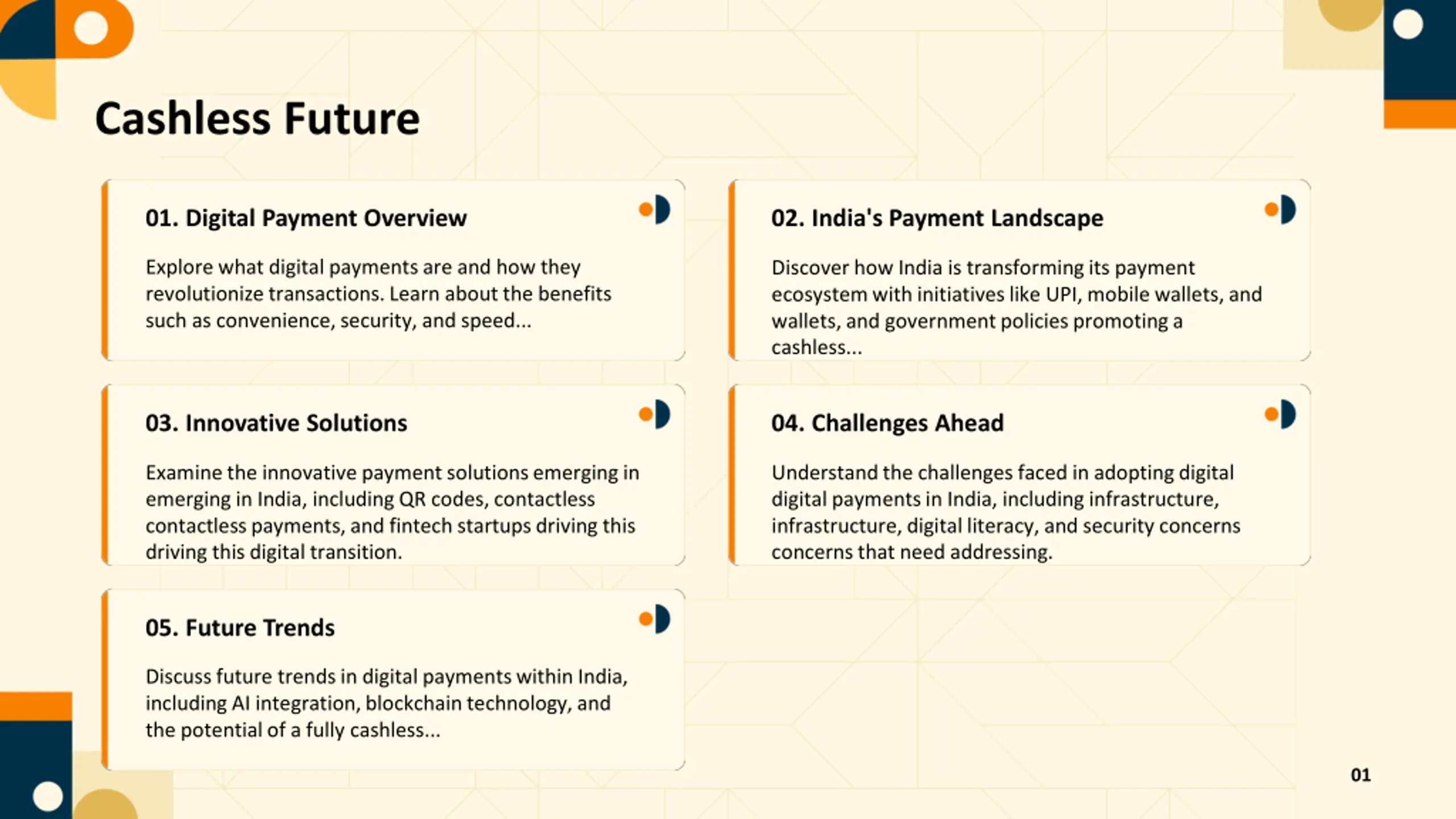 Cashless Future 01. Digital Payment Overview 02. India's Payment Landscape Explore what digital payments are and how they revolutionize transactions. Learn about the benefits such as convenience, security, and speed... Discover how India is transforming its payment ecosystem with initiatives like UPI, mobile wallets, and wallets, and government policies promoting a cashless... 03. Innovative Solutions 04. Challenges Ahead Examine the innovative payment solutions emerging in emerging in India, including QR codes, contactless contactless payments, and fintech startups driving this driving this digital transition. Understand the challenges faced in adopting digital digital payments in India, including infrastructure, infrastructure, digital literacy, and security concerns concerns that need addressing. 05. Future Trends Discuss future trends in digital payments within India, including AI integration, blockchain technology, and the potential of a fully cashless... 01