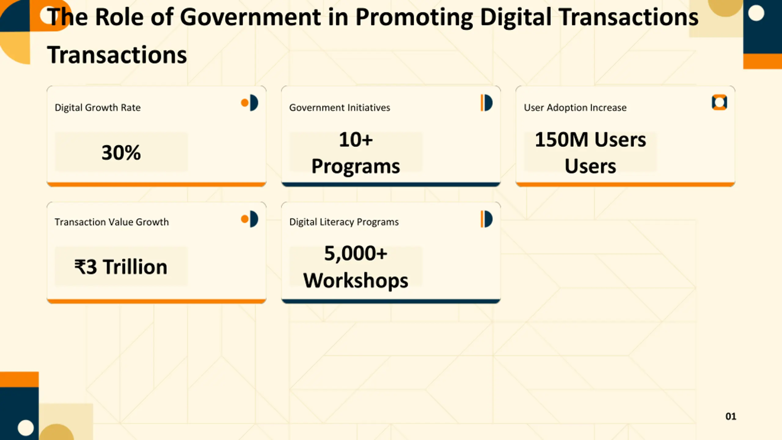 The Role of Government in Promoting Digital Transactions Transactions Digital Growth Rate Government Initiatives User Adoption Increase 10+ 150M Users Users 30% Programs Digital Literacy Programs Transaction Value Growth 5,000+ Workshops 3 Trillion 01