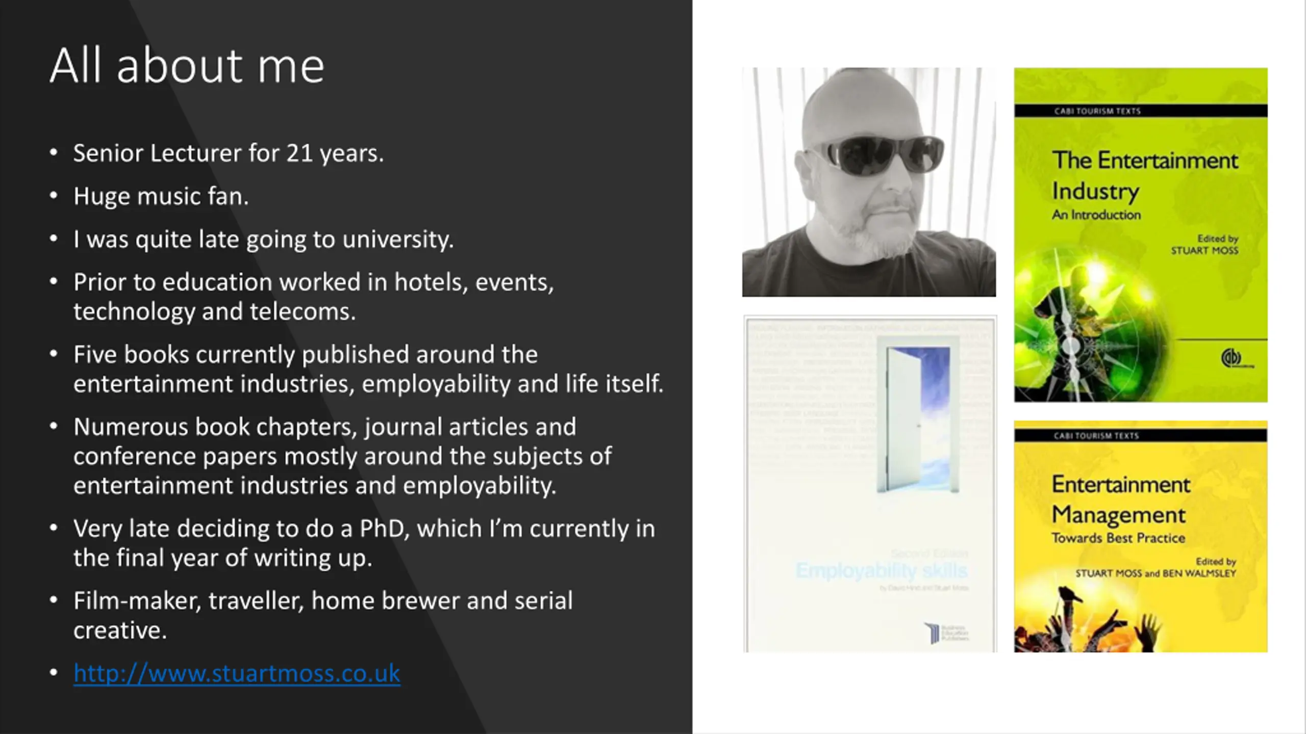 All about me Senior Lecturer for 21 years. Huge music fan. I was quite late going to university. Prior to education worked in hotels, events, technology and telecoms. Five books currently published around the entertainment industries, employability and life itself. Numerous book chapters, journal articles and conference papers mostly around the subjects of entertainment industries and employability. Very late deciding to do a PhD, which I m currently in the final year of writing up. Film-maker, traveller, home brewer and serial creative. http://www.stuartmoss.co.uk