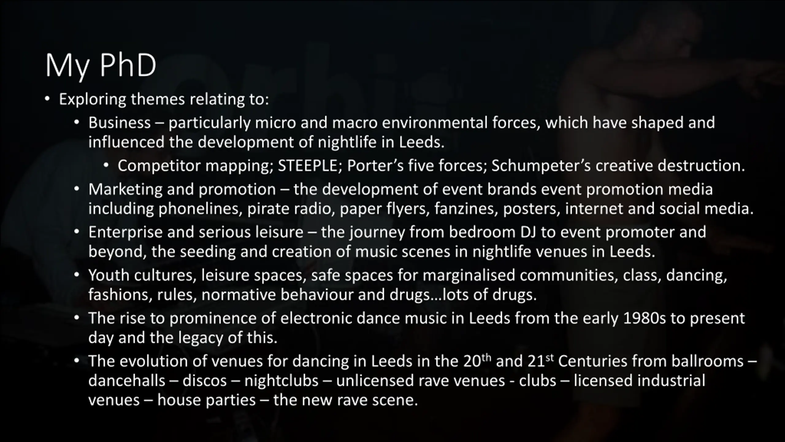My PhD Exploring themes relating to: Business particularly micro and macro environmental forces, which have shaped and influenced the development of nightlife in Leeds. Competitor mapping; STEEPLE; Porter s five forces; Schumpeter s creative destruction. Marketing and promotion the development of event brands event promotion media including phonelines, pirate radio, paper flyers, fanzines, posters, internet and social media. Enterprise and serious leisure the journey from bedroom DJ to event promoter and beyond, the seeding and creation of music scenes in nightlife venues in Leeds. Youth cultures, leisure spaces, safe spaces for marginalised communities, class, dancing, fashions, rules, normative behaviour and drugs lots of drugs. The rise to prominence of electronic dance music in Leeds from the early 1980s to present day and the legacy of this. The evolution of venues for dancing in Leeds in the 20thand 21stCenturies from ballrooms dancehalls discos nightclubs unlicensed rave venues - clubs licensed industrial venues house parties the new rave scene.