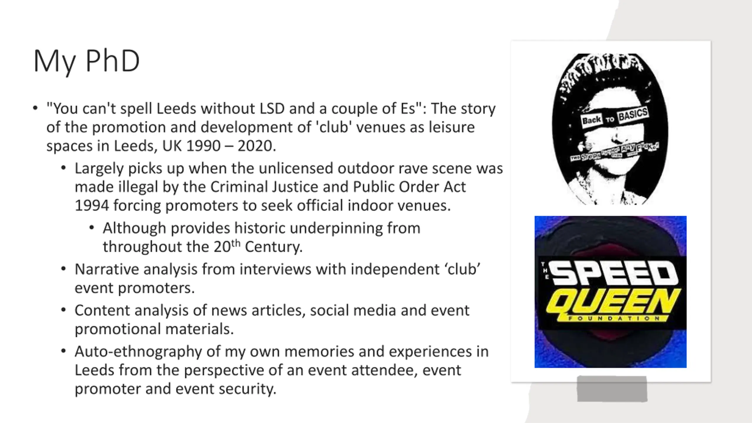 My PhD "You can't spell Leeds without LSD and a couple of Es": The story of the promotion and development of 'club' venues as leisure spaces in Leeds, UK 1990 2020. Largely picks up when the unlicensed outdoor rave scene was made illegal by the Criminal Justice and Public Order Act 1994 forcing promoters to seek official indoor venues. Although provides historic underpinning from throughout the 20thCentury. Narrative analysis from interviews with independent club event promoters. Content analysis of news articles, social media and event promotional materials. Auto-ethnography of my own memories and experiences in Leeds from the perspective of an event attendee, event promoter and event security.