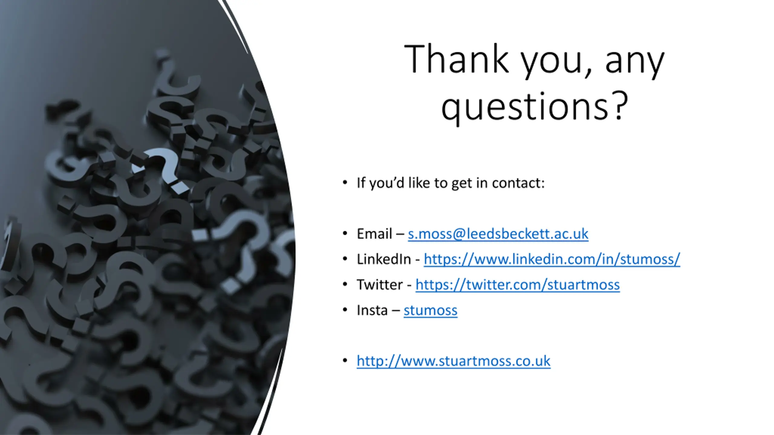 Thank you, any questions? If you d like to get in contact: Email s.moss@leedsbeckett.ac.uk LinkedIn - https://www.linkedin.com/in/stumoss/ Twitter - https://twitter.com/stuartmoss Insta stumoss http://www.stuartmoss.co.uk