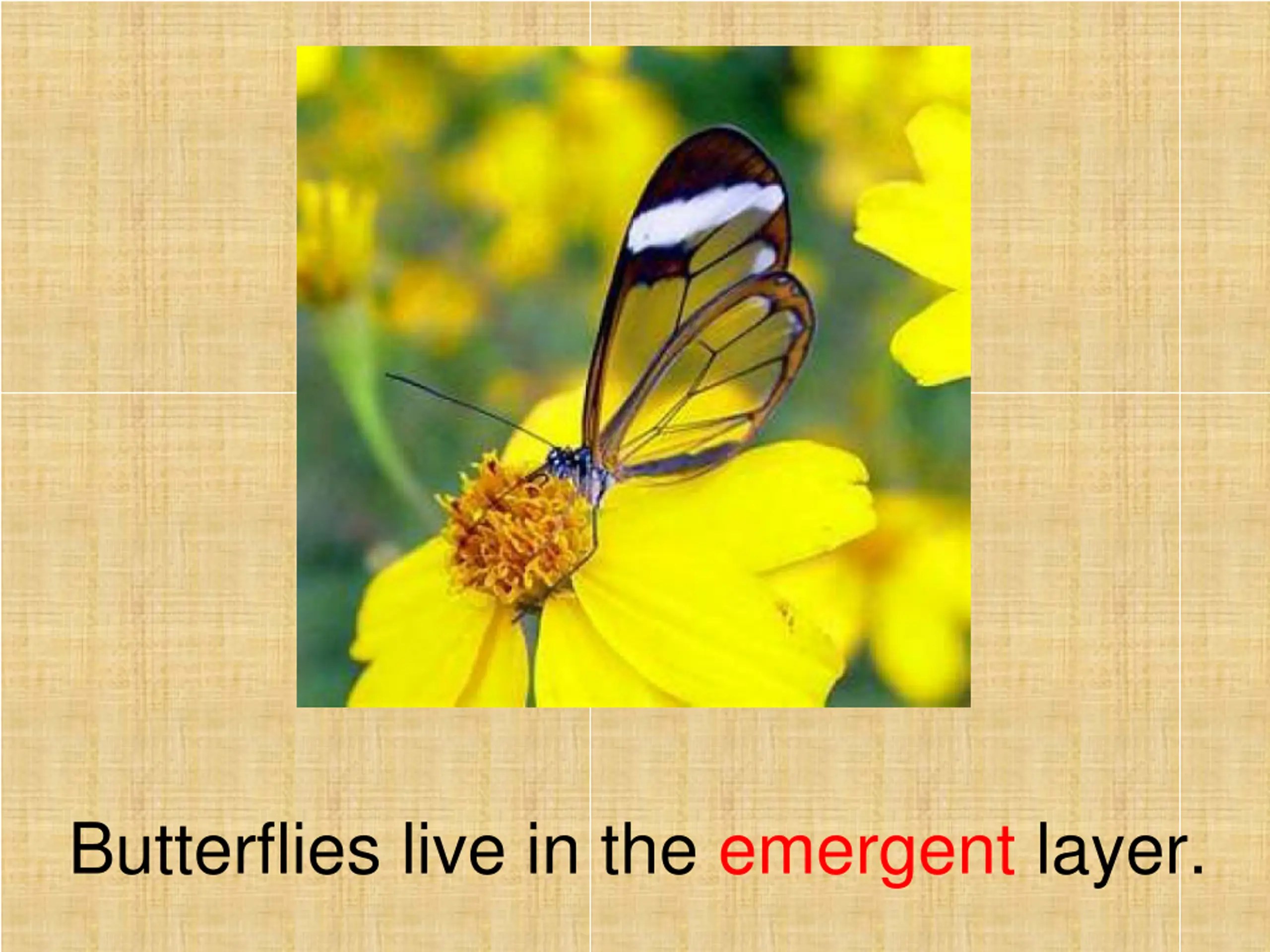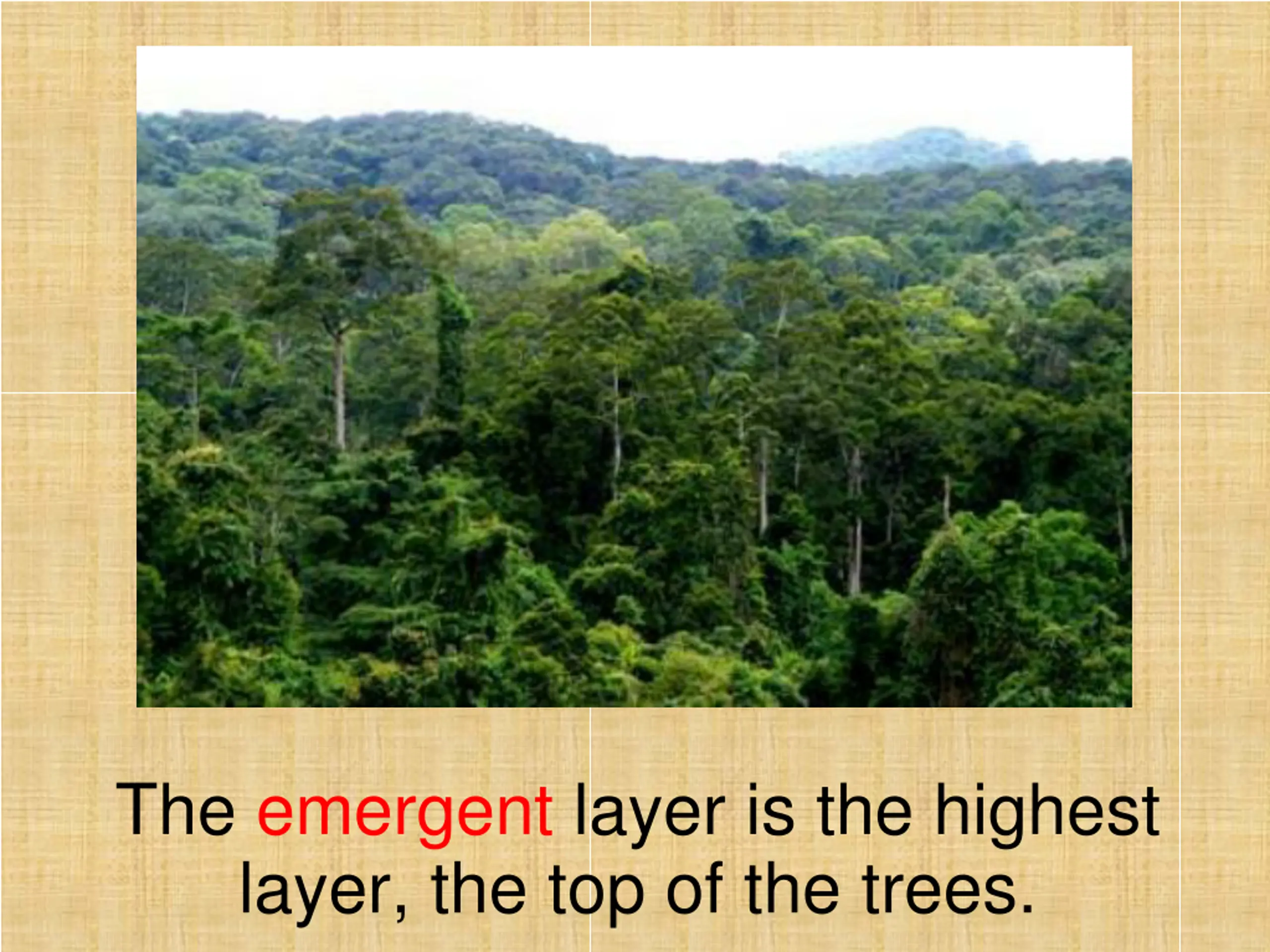 The emergent layer is the highest layer, the top of the trees.